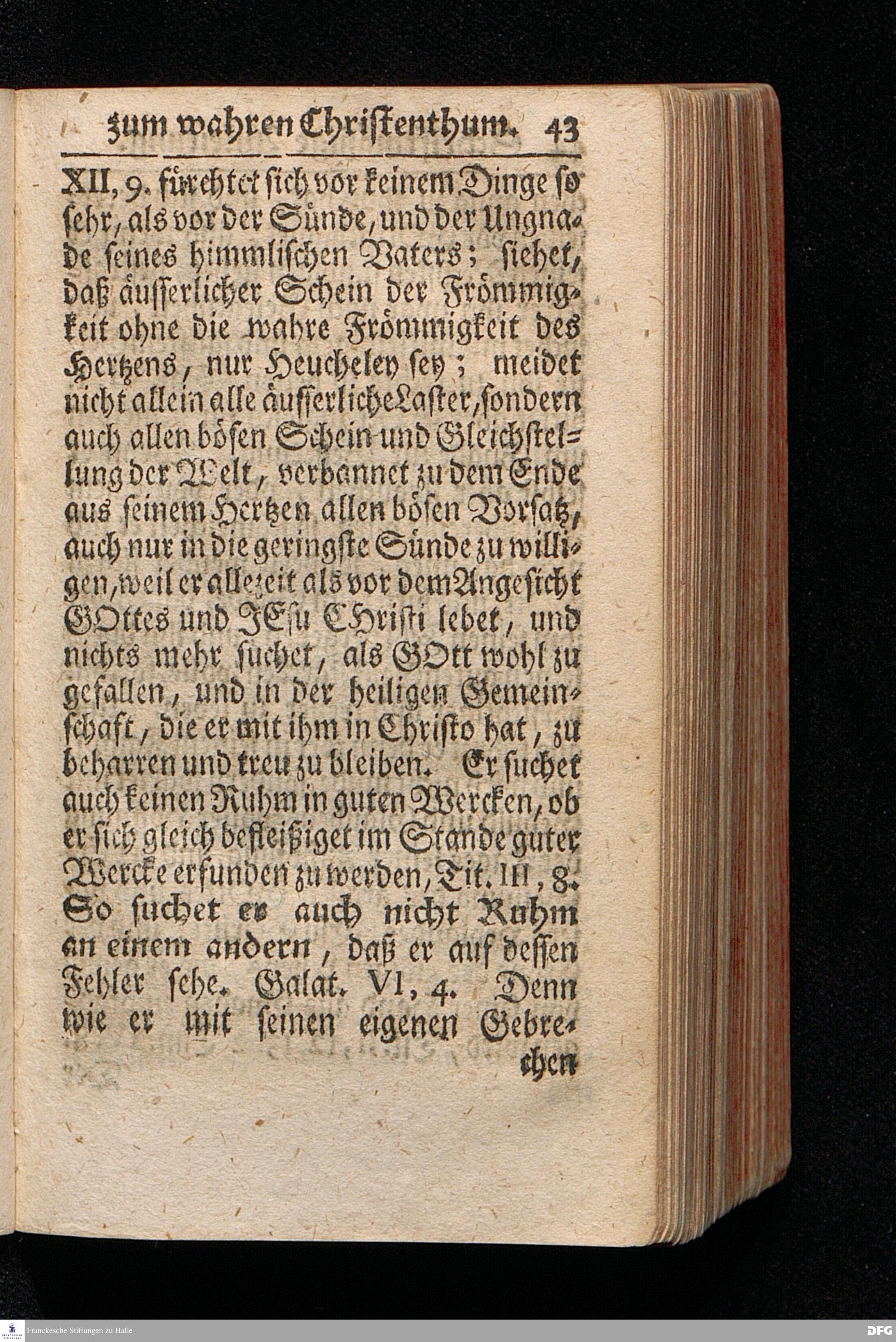 Die Lehre Vom Anfang Christliches Lebens / Bestehend in vier Theilen: I. In einer gründlichen Anleitung zu wahrer Busse und Glauben an GOTT. II. In einem einfältigen Unterricht, wie man die H.Schrift zu seiner wahren Erbauung lesen solle. III. In einer Schriftmäßigen Anweisung recht und GOTT gefällig zu beten. IV. In einer kurtzen Prüfung / ob man den wahren lebendigen Glauben an CHristum habe oder nicht. Die XIII.Auflage. HALLE, In Verlegung des Wäysenhauses, 1730.