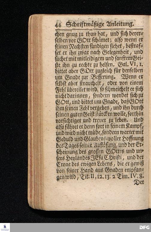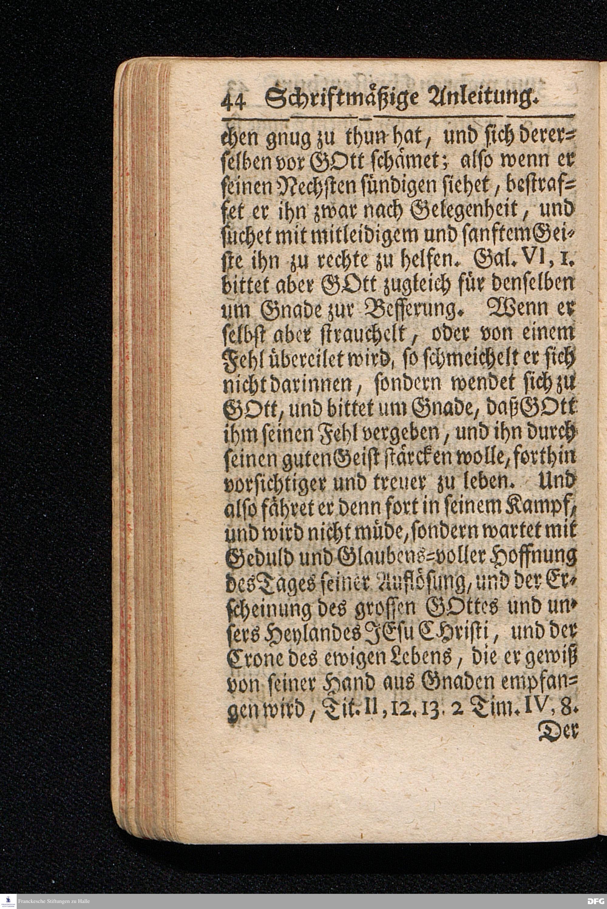 Die Lehre Vom Anfang Christliches Lebens / Bestehend in vier Theilen: I. In einer gründlichen Anleitung zu wahrer Busse und Glauben an GOTT. II. In einem einfältigen Unterricht, wie man die H.Schrift zu seiner wahren Erbauung lesen solle. III. In einer Schriftmäßigen Anweisung recht und GOTT gefällig zu beten. IV. In einer kurtzen Prüfung / ob man den wahren lebendigen Glauben an CHristum habe oder nicht. Die XIII.Auflage. HALLE, In Verlegung des Wäysenhauses, 1730.