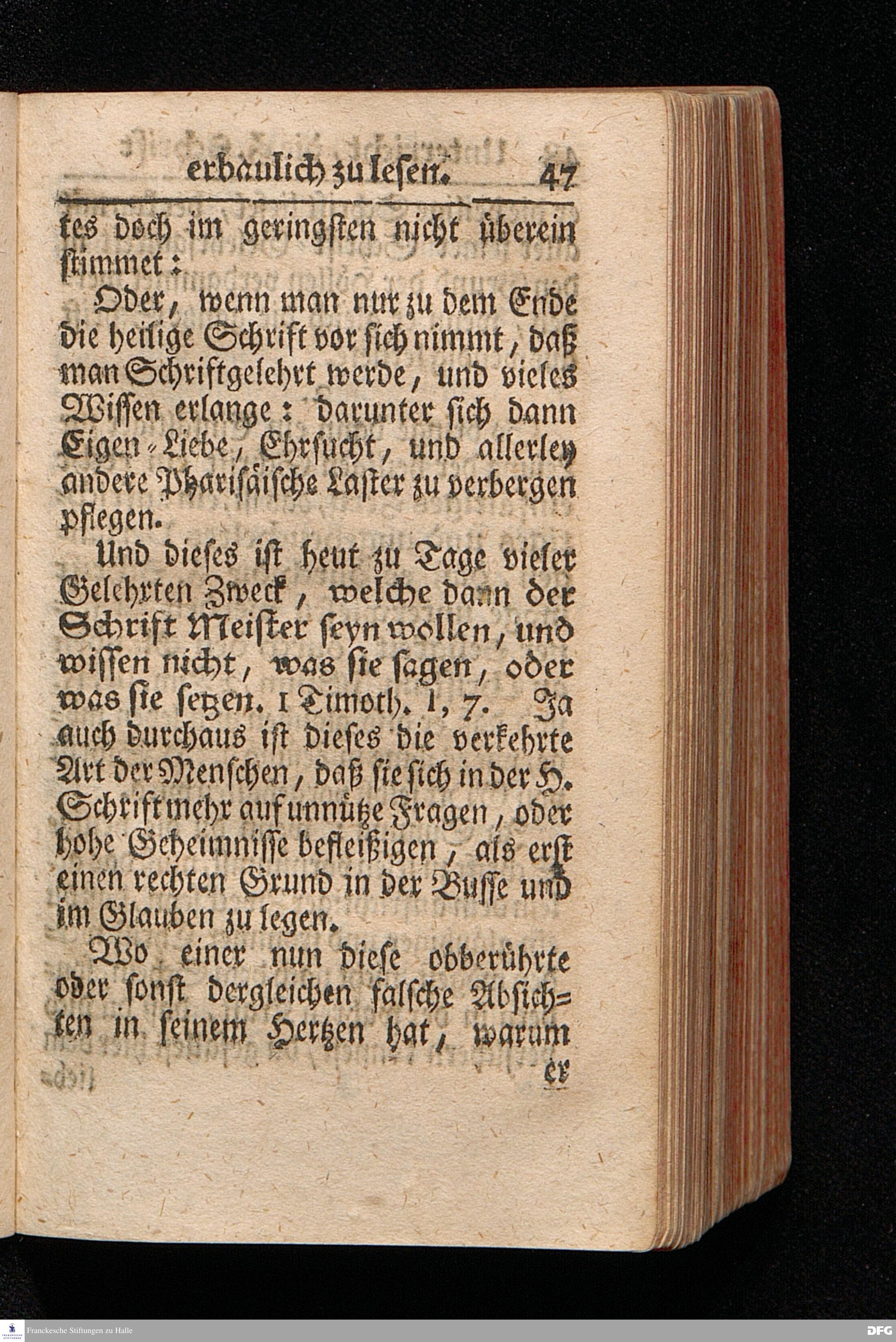 Die Lehre Vom Anfang Christliches Lebens / Bestehend in vier Theilen: I. In einer gründlichen Anleitung zu wahrer Busse und Glauben an GOTT. II. In einem einfältigen Unterricht, wie man die H.Schrift zu seiner wahren Erbauung lesen solle. III. In einer Schriftmäßigen Anweisung recht und GOTT gefällig zu beten. IV. In einer kurtzen Prüfung / ob man den wahren lebendigen Glauben an CHristum habe oder nicht. Die XIII.Auflage. HALLE, In Verlegung des Wäysenhauses, 1730.