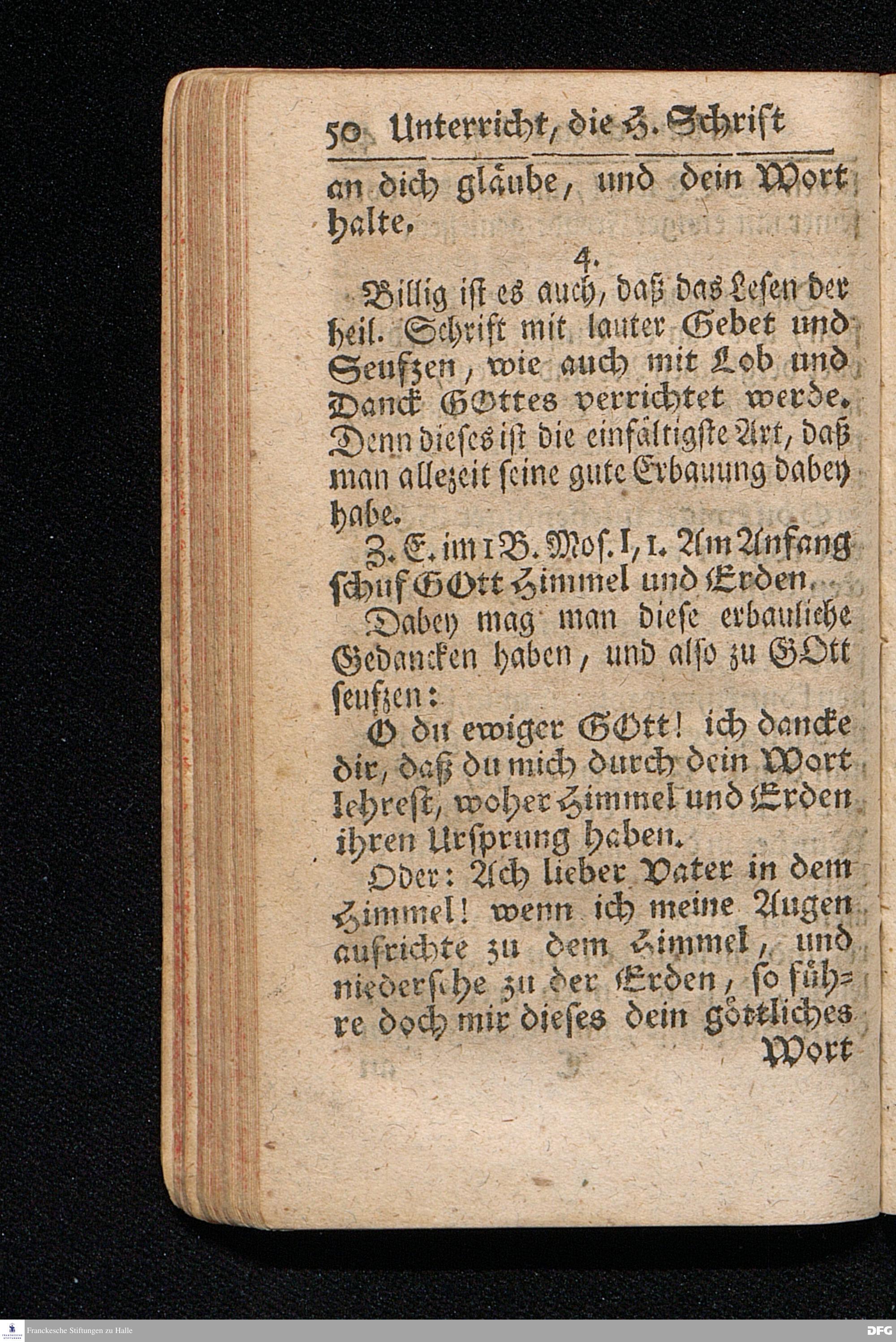 Die Lehre Vom Anfang Christliches Lebens / Bestehend in vier Theilen: I. In einer gründlichen Anleitung zu wahrer Busse und Glauben an GOTT. II. In einem einfältigen Unterricht, wie man die H.Schrift zu seiner wahren Erbauung lesen solle. III. In einer Schriftmäßigen Anweisung recht und GOTT gefällig zu beten. IV. In einer kurtzen Prüfung / ob man den wahren lebendigen Glauben an CHristum habe oder nicht. Die XIII.Auflage. HALLE, In Verlegung des Wäysenhauses, 1730.