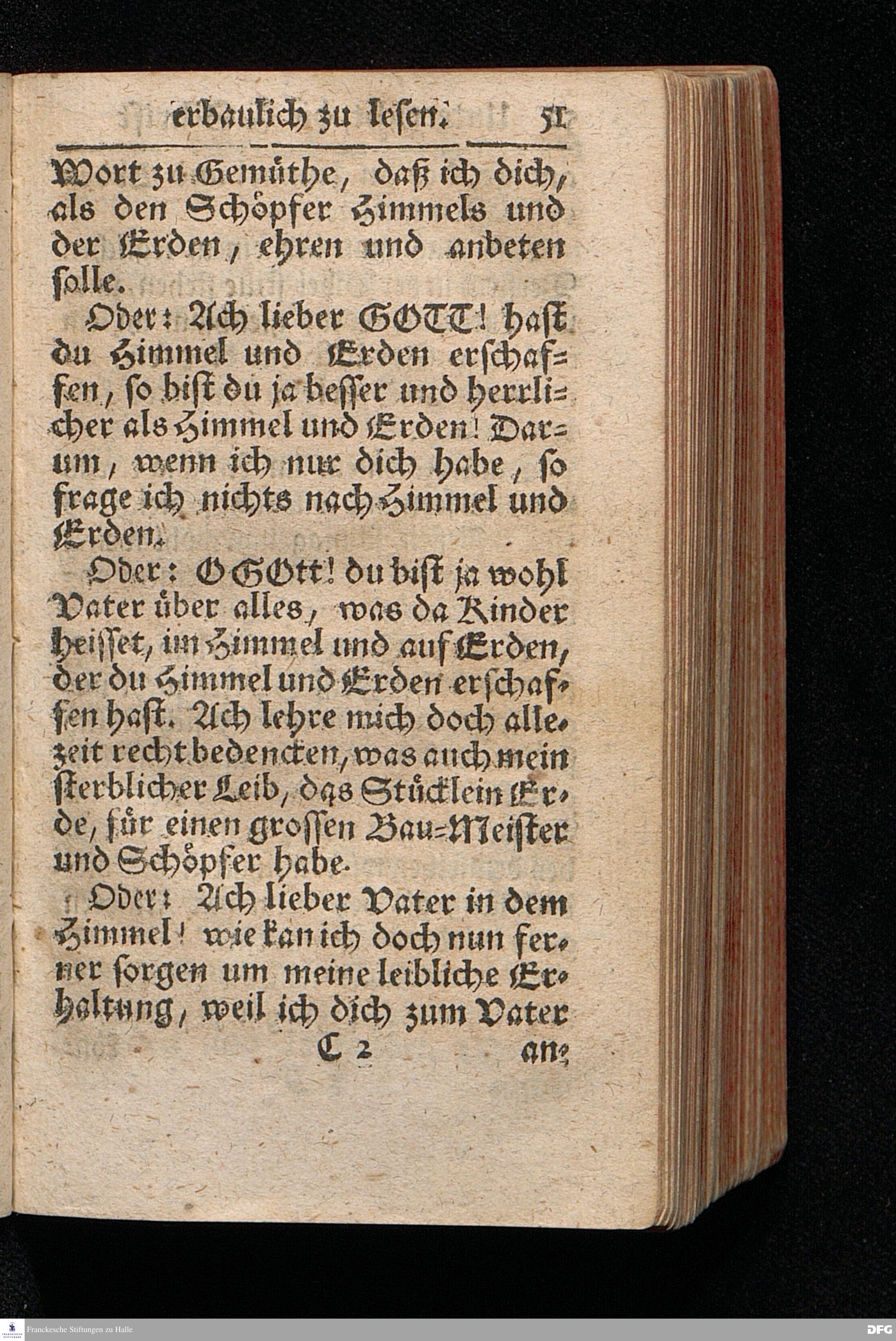 Die Lehre Vom Anfang Christliches Lebens / Bestehend in vier Theilen: I. In einer gründlichen Anleitung zu wahrer Busse und Glauben an GOTT. II. In einem einfältigen Unterricht, wie man die H.Schrift zu seiner wahren Erbauung lesen solle. III. In einer Schriftmäßigen Anweisung recht und GOTT gefällig zu beten. IV. In einer kurtzen Prüfung / ob man den wahren lebendigen Glauben an CHristum habe oder nicht. Die XIII.Auflage. HALLE, In Verlegung des Wäysenhauses, 1730.