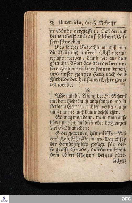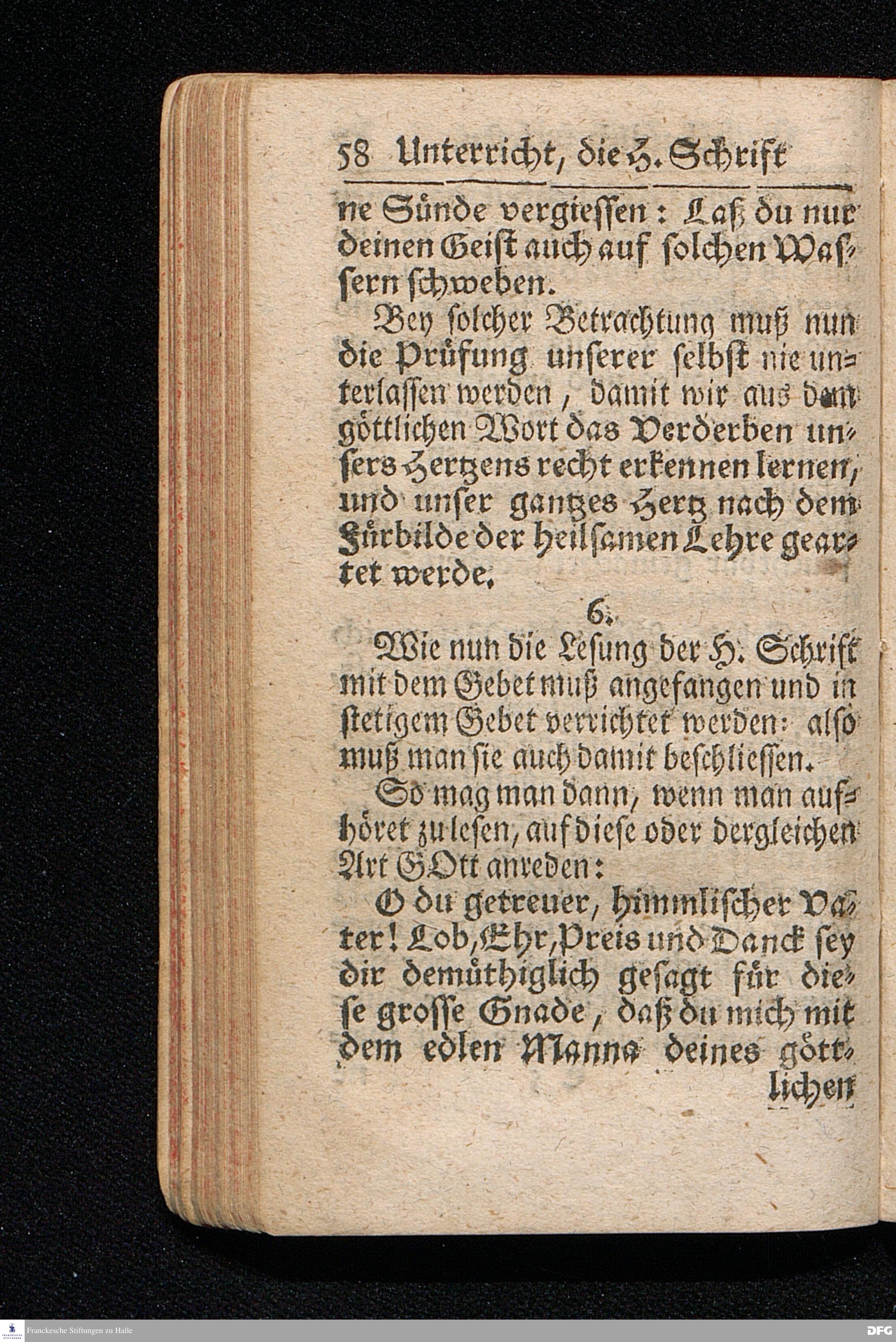 Die Lehre Vom Anfang Christliches Lebens / Bestehend in vier Theilen: I. In einer gründlichen Anleitung zu wahrer Busse und Glauben an GOTT. II. In einem einfältigen Unterricht, wie man die H.Schrift zu seiner wahren Erbauung lesen solle. III. In einer Schriftmäßigen Anweisung recht und GOTT gefällig zu beten. IV. In einer kurtzen Prüfung / ob man den wahren lebendigen Glauben an CHristum habe oder nicht. Die XIII.Auflage. HALLE, In Verlegung des Wäysenhauses, 1730.