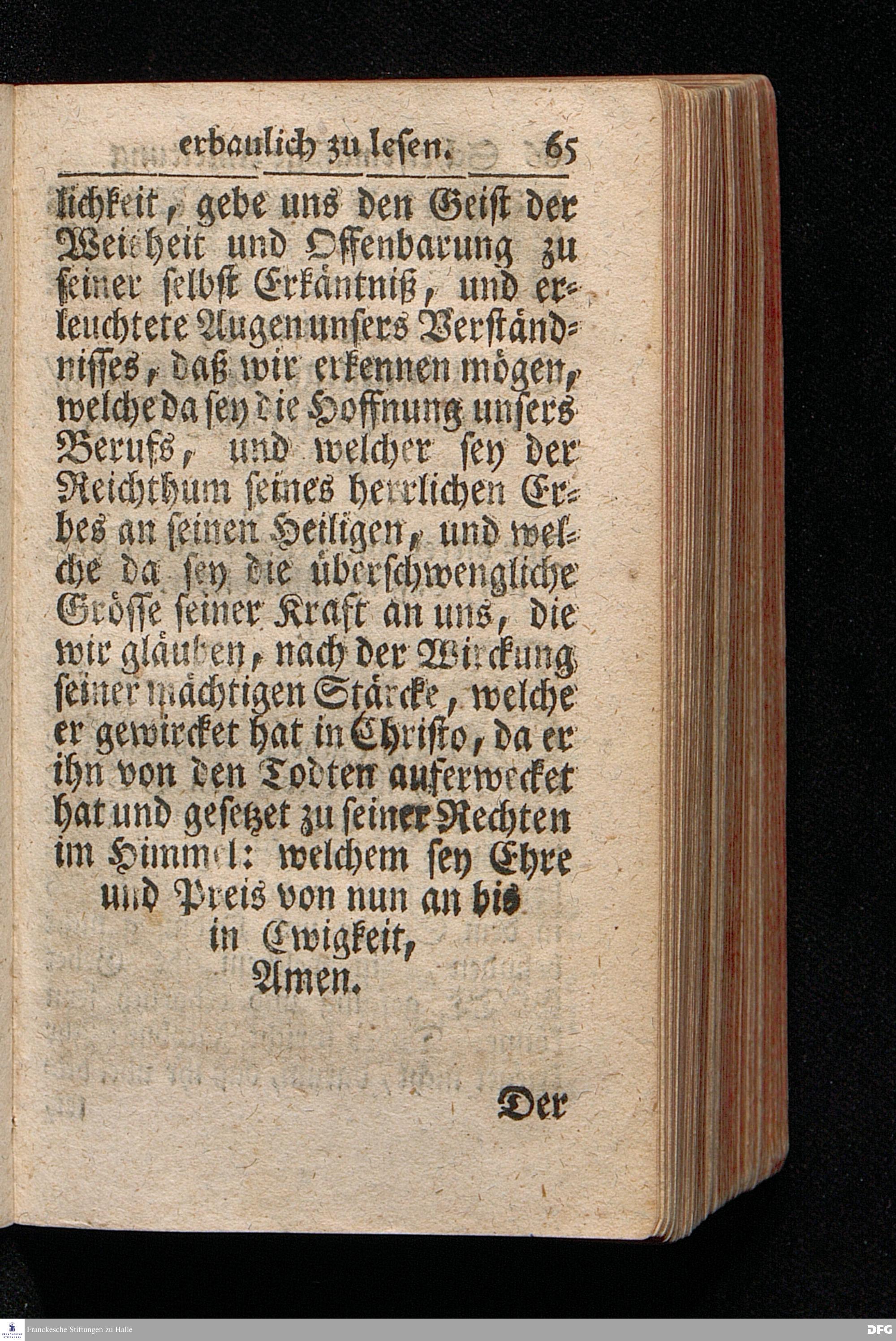 Die Lehre Vom Anfang Christliches Lebens / Bestehend in vier Theilen: I. In einer gründlichen Anleitung zu wahrer Busse und Glauben an GOTT. II. In einem einfältigen Unterricht, wie man die H.Schrift zu seiner wahren Erbauung lesen solle. III. In einer Schriftmäßigen Anweisung recht und GOTT gefällig zu beten. IV. In einer kurtzen Prüfung / ob man den wahren lebendigen Glauben an CHristum habe oder nicht. Die XIII.Auflage. HALLE, In Verlegung des Wäysenhauses, 1730.