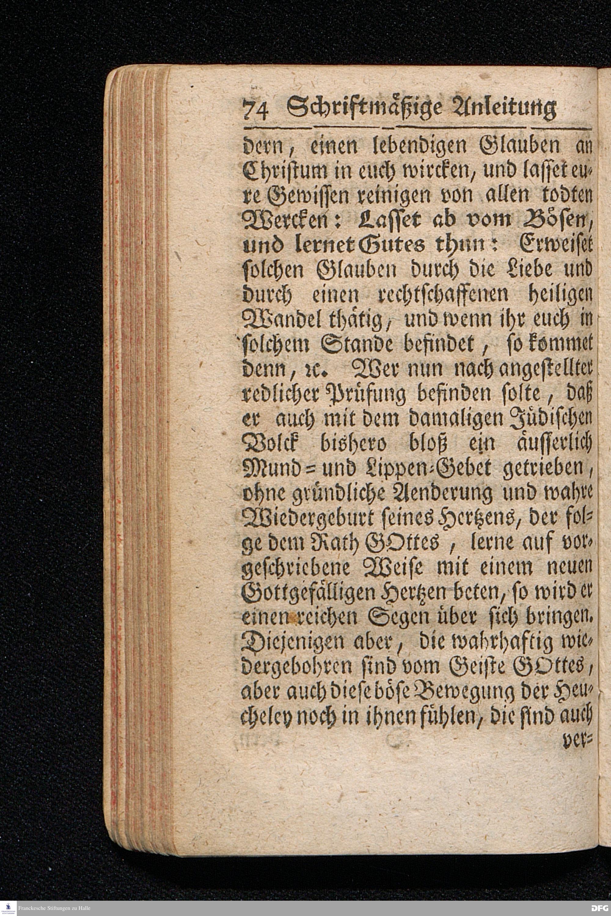 Die Lehre Vom Anfang Christliches Lebens / Bestehend in vier Theilen: I. In einer gründlichen Anleitung zu wahrer Busse und Glauben an GOTT. II. In einem einfältigen Unterricht, wie man die H.Schrift zu seiner wahren Erbauung lesen solle. III. In einer Schriftmäßigen Anweisung recht und GOTT gefällig zu beten. IV. In einer kurtzen Prüfung / ob man den wahren lebendigen Glauben an CHristum habe oder nicht. Die XIII.Auflage. HALLE, In Verlegung des Wäysenhauses, 1730.