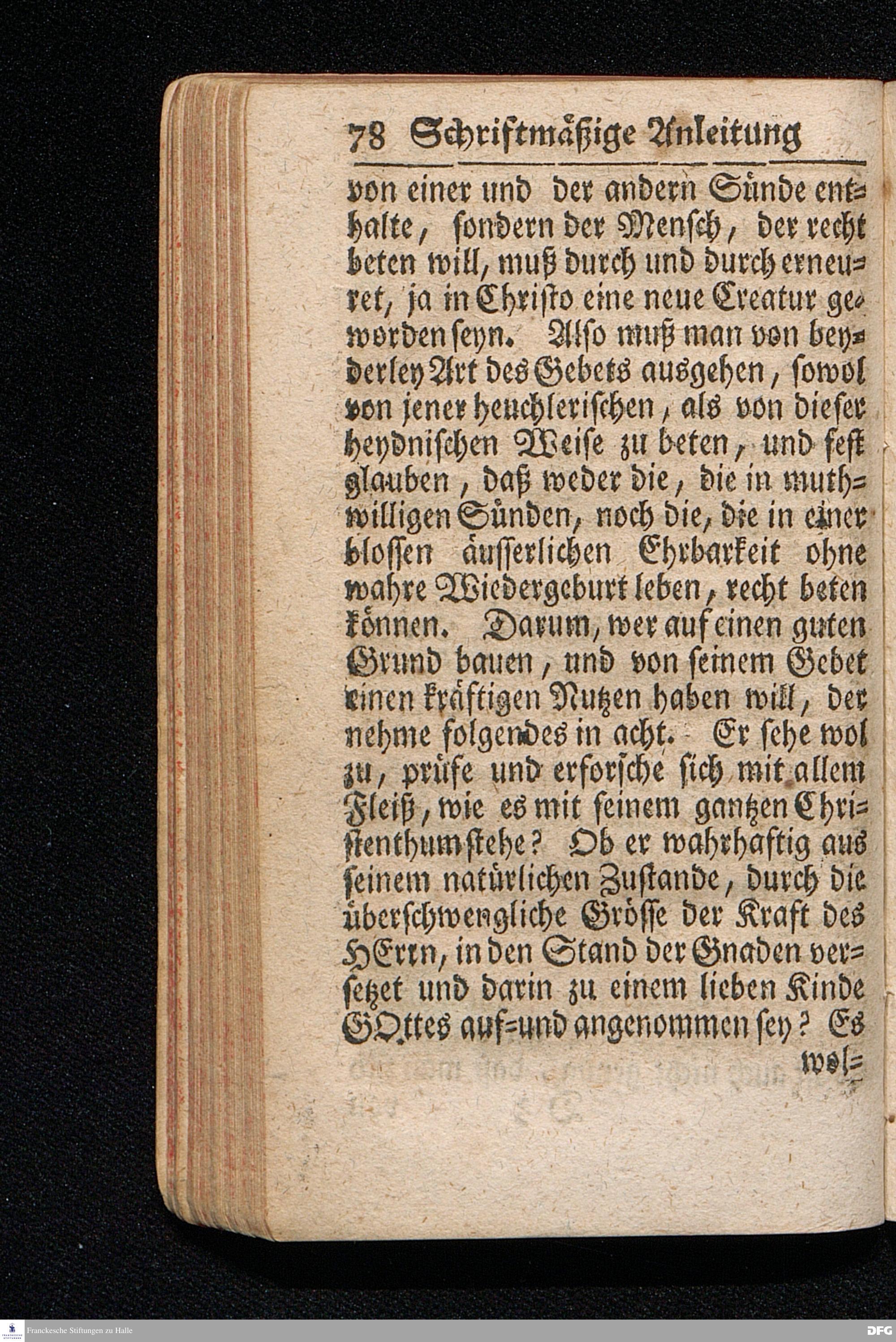 Die Lehre Vom Anfang Christliches Lebens / Bestehend in vier Theilen: I. In einer gründlichen Anleitung zu wahrer Busse und Glauben an GOTT. II. In einem einfältigen Unterricht, wie man die H.Schrift zu seiner wahren Erbauung lesen solle. III. In einer Schriftmäßigen Anweisung recht und GOTT gefällig zu beten. IV. In einer kurtzen Prüfung / ob man den wahren lebendigen Glauben an CHristum habe oder nicht. Die XIII.Auflage. HALLE, In Verlegung des Wäysenhauses, 1730.