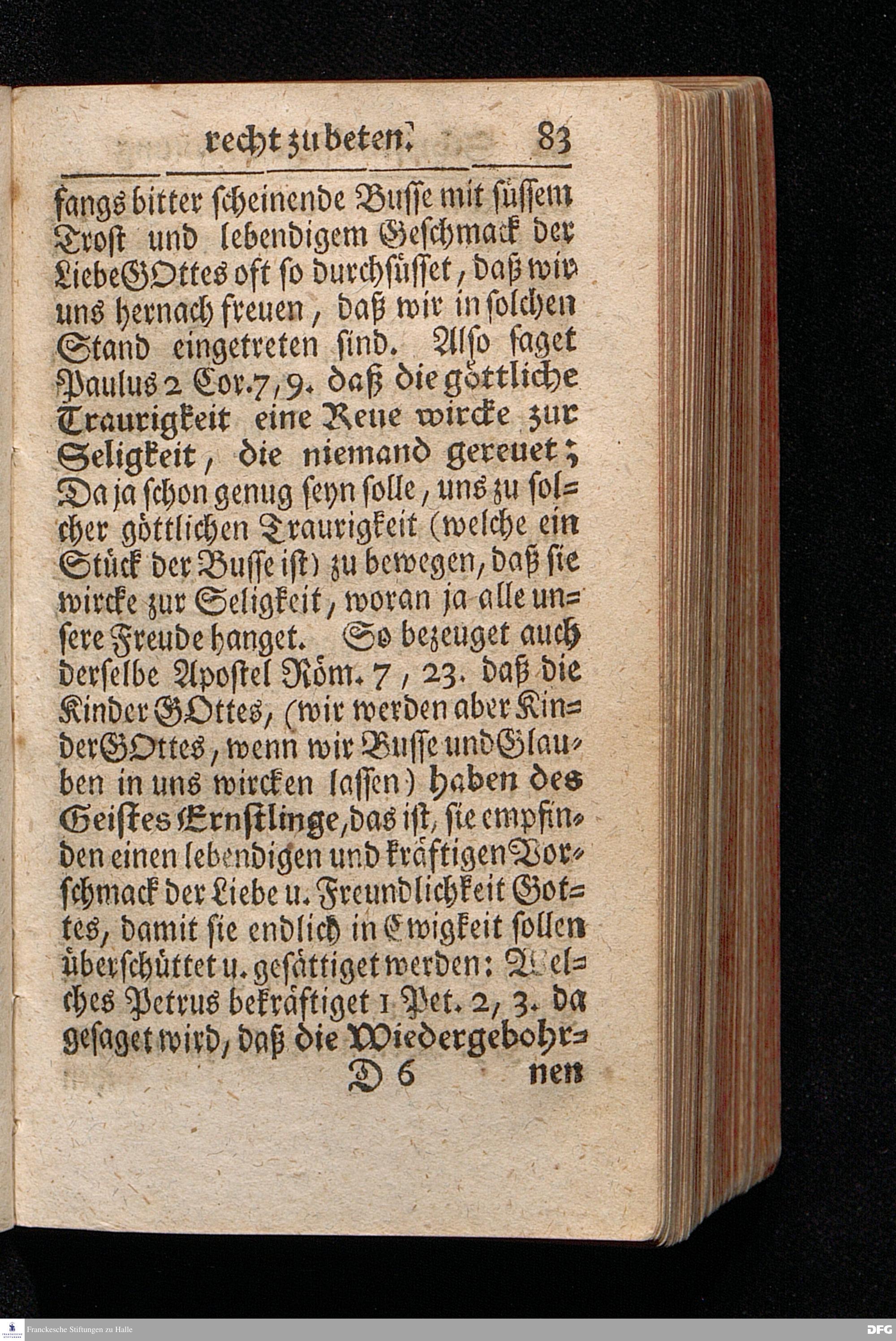 Die Lehre Vom Anfang Christliches Lebens / Bestehend in vier Theilen: I. In einer gründlichen Anleitung zu wahrer Busse und Glauben an GOTT. II. In einem einfältigen Unterricht, wie man die H.Schrift zu seiner wahren Erbauung lesen solle. III. In einer Schriftmäßigen Anweisung recht und GOTT gefällig zu beten. IV. In einer kurtzen Prüfung / ob man den wahren lebendigen Glauben an CHristum habe oder nicht. Die XIII.Auflage. HALLE, In Verlegung des Wäysenhauses, 1730.