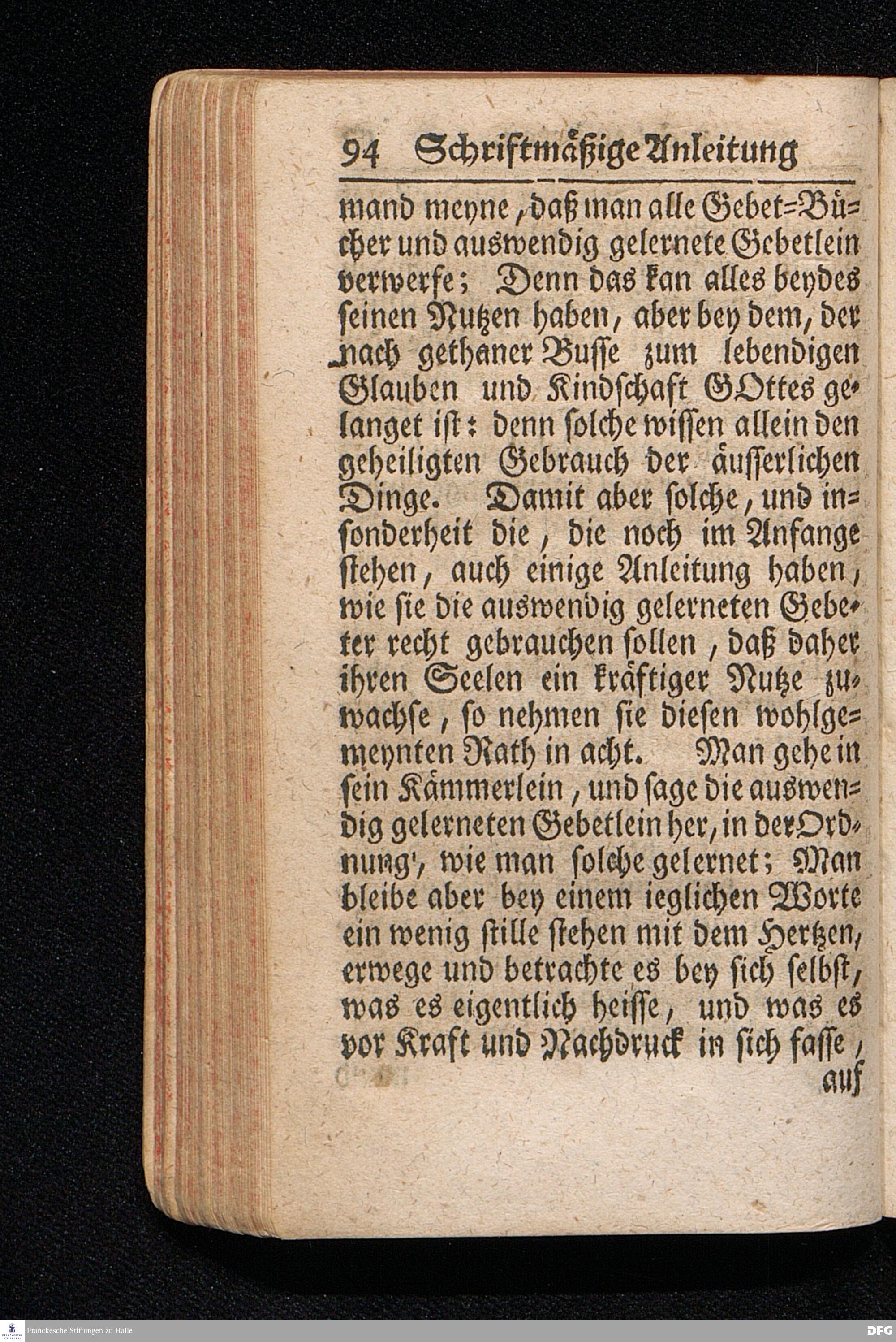 Die Lehre Vom Anfang Christliches Lebens / Bestehend in vier Theilen: I. In einer gründlichen Anleitung zu wahrer Busse und Glauben an GOTT. II. In einem einfältigen Unterricht, wie man die H.Schrift zu seiner wahren Erbauung lesen solle. III. In einer Schriftmäßigen Anweisung recht und GOTT gefällig zu beten. IV. In einer kurtzen Prüfung / ob man den wahren lebendigen Glauben an CHristum habe oder nicht. Die XIII.Auflage. HALLE, In Verlegung des Wäysenhauses, 1730.