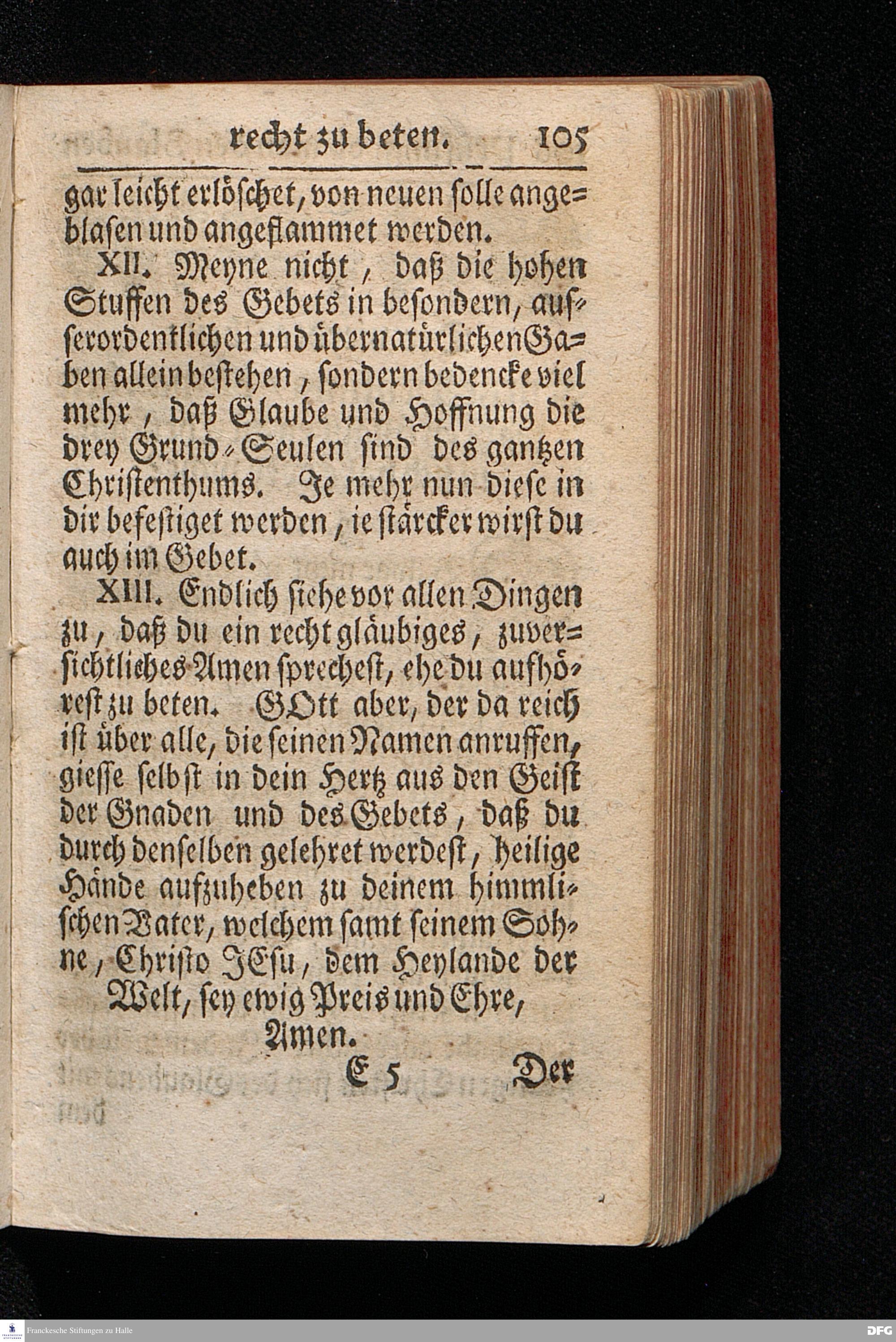 Die Lehre Vom Anfang Christliches Lebens / Bestehend in vier Theilen: I. In einer gründlichen Anleitung zu wahrer Busse und Glauben an GOTT. II. In einem einfältigen Unterricht, wie man die H.Schrift zu seiner wahren Erbauung lesen solle. III. In einer Schriftmäßigen Anweisung recht und GOTT gefällig zu beten. IV. In einer kurtzen Prüfung / ob man den wahren lebendigen Glauben an CHristum habe oder nicht. Die XIII.Auflage. HALLE, In Verlegung des Wäysenhauses, 1730.