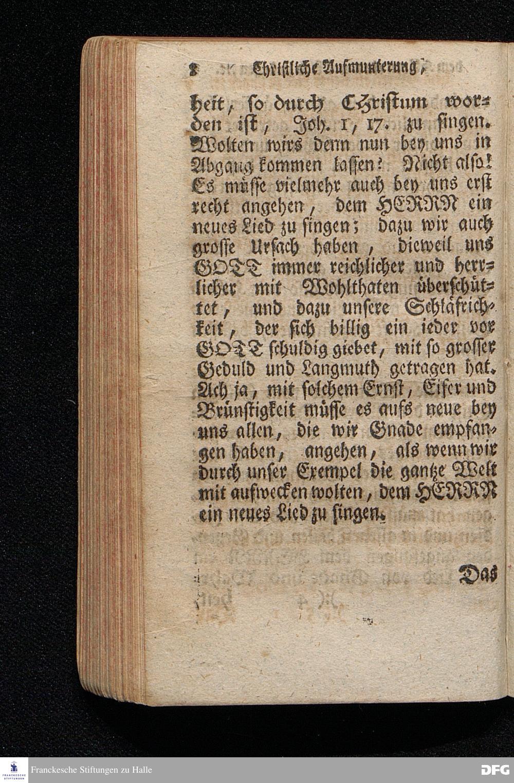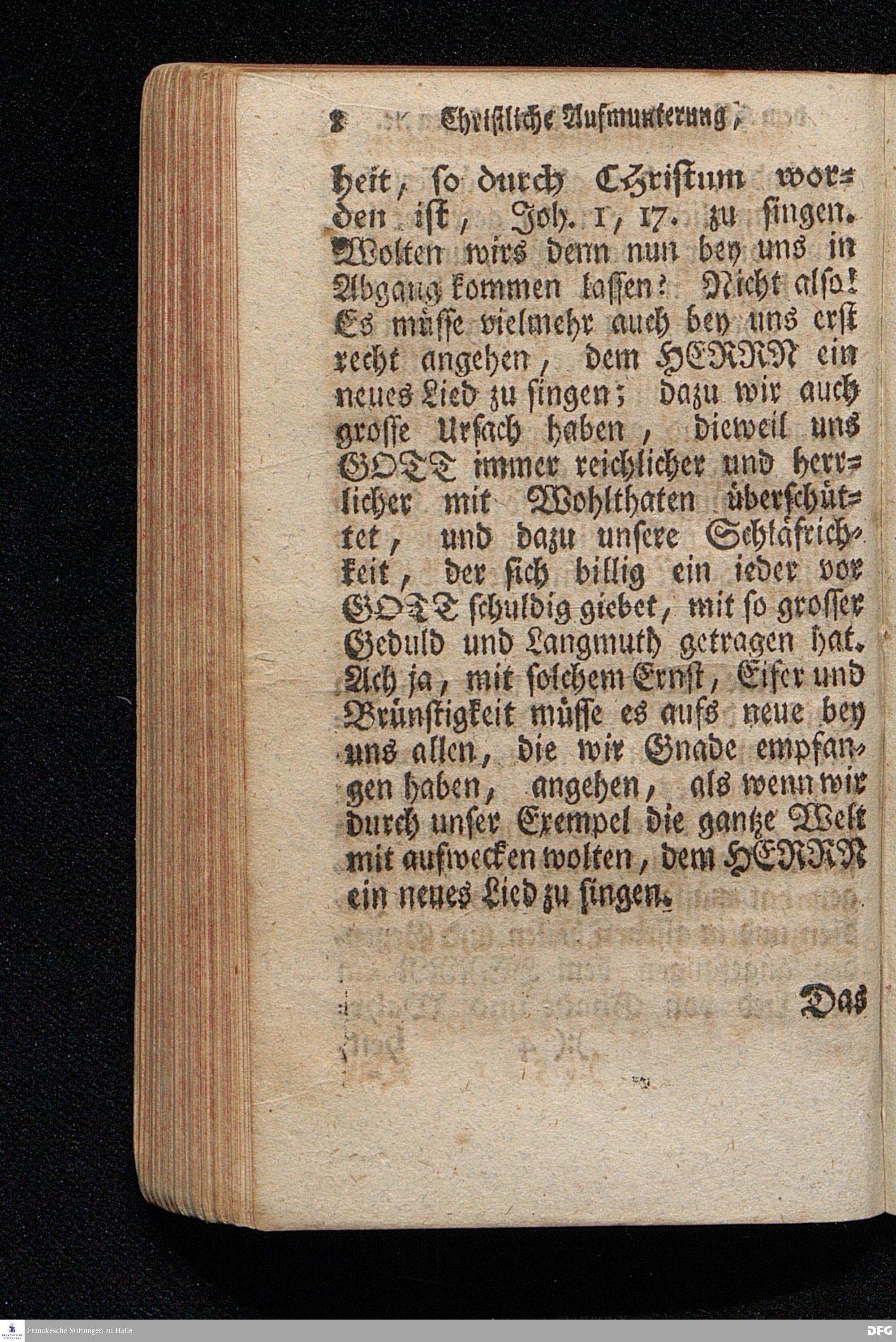 Eine Christliche Aufmunterung / Dem HERRN ein neues Lied zu singen / zu loben seinen Namen / zu predigen einen Tag am andern sein Heil / und seine Ehre und Wunder zu erzehlen / Giebet allen seinen Auswärtigen dem Angesichte nach bekanten und unbekanten Freunden, die ihr Hertz dem HErrn JEsu in der Wahrheit gegeben haben, Zum Neuen Jahr 1723. August Hermann Francke / S.Th.Prof.Past.Vlic.u.des Gymn.Schol.zu Halle im Hertzogth.Magdeburg. HALLE, gedruckt im Wäysenhause 1730