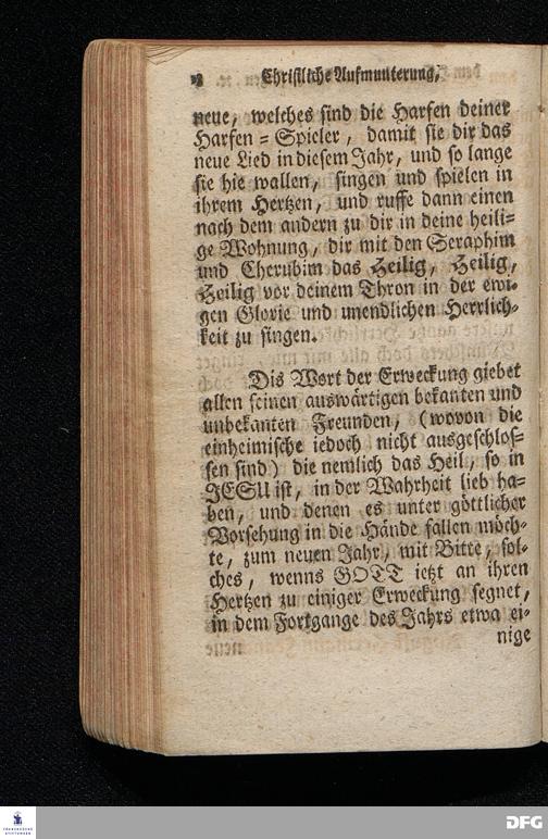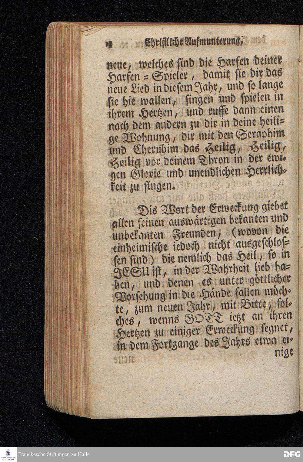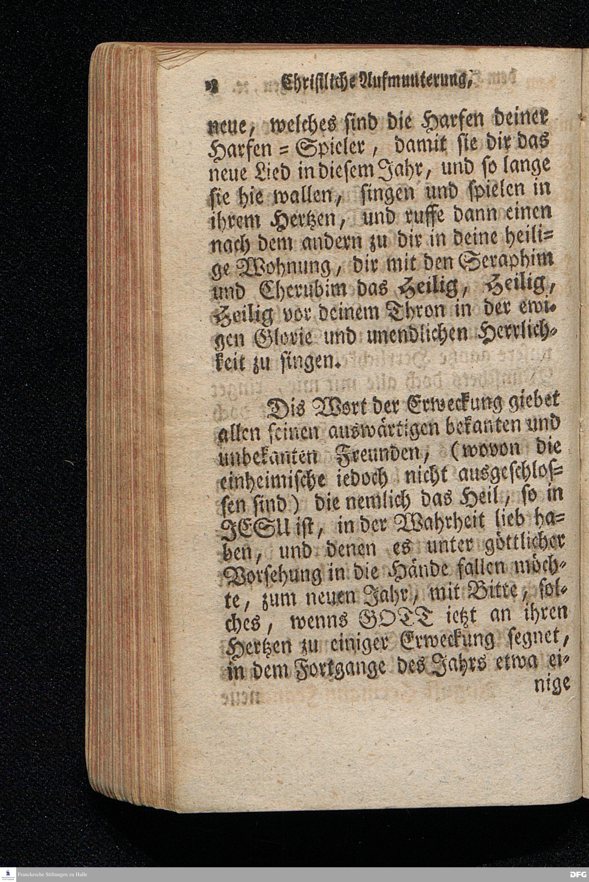 Eine Christliche Aufmunterung / Dem HERRN ein neues Lied zu singen / zu loben seinen Namen / zu predigen einen Tag am andern sein Heil / und seine Ehre und Wunder zu erzehlen / Giebet allen seinen Auswärtigen dem Angesichte nach bekanten und unbekanten Freunden, die ihr Hertz dem HErrn JEsu in der Wahrheit gegeben haben, Zum Neuen Jahr 1723. August Hermann Francke / S.Th.Prof.Past.Vlic.u.des Gymn.Schol.zu Halle im Hertzogth.Magdeburg. HALLE, gedruckt im Wäysenhause 1730