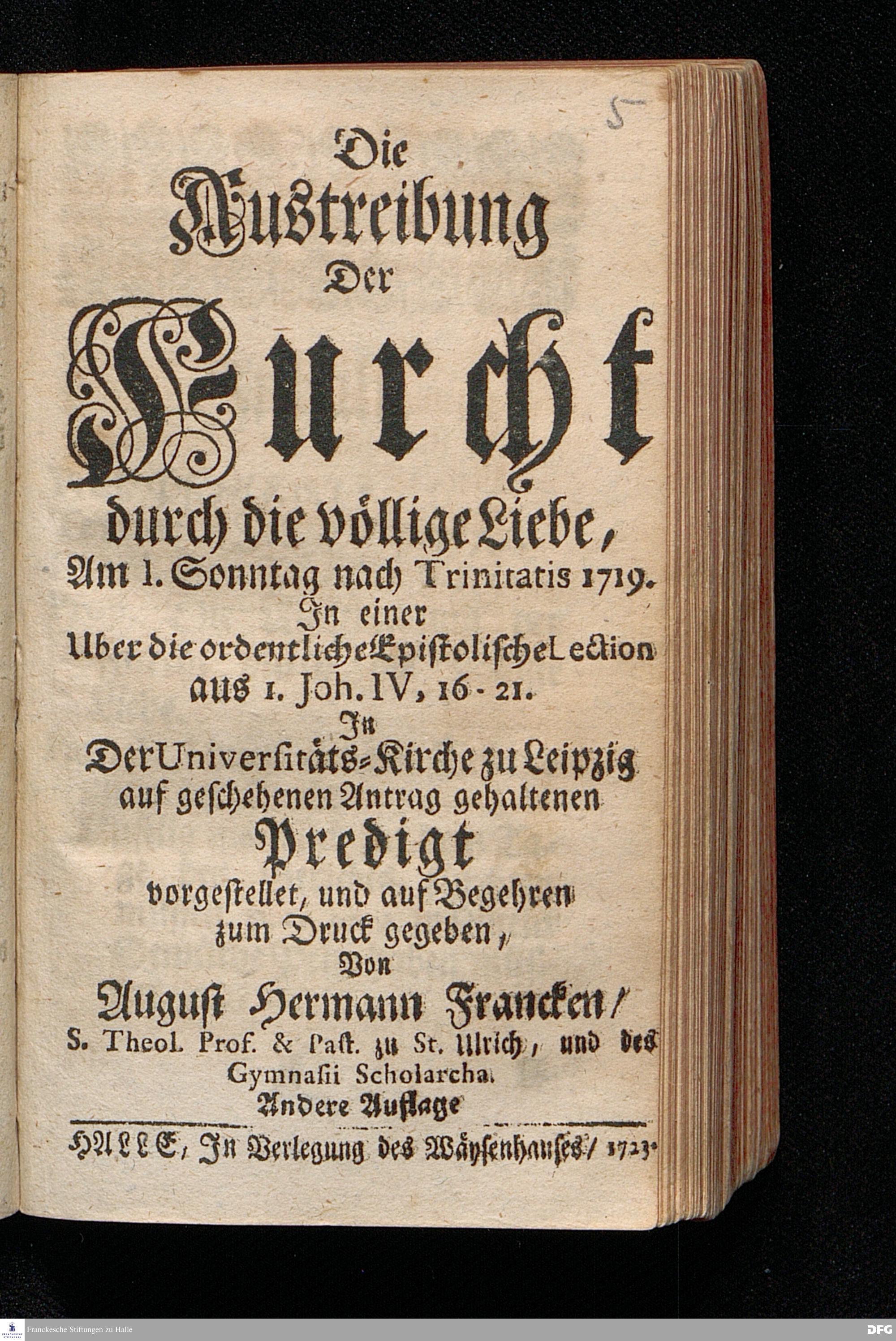 Die Austreibung Der Furcht durch die völlige Liebe, Am I.Sonntag nach Trinitatis 1719. In einer Uber die ordentliche Epistolische Lection aus I.Joh.IV, 16-21. In Der Universitäts=Kirche zu Leipzig auf geschehenen Antrag gehaltenen Predigt vorgestellet, und auf Begehren zum Druck gegeben, Von August Hermann Francken / S.Theol.Prof.& Past.zu St.Ulrich, und des Gymnasii Scholarcha. Andere Auflage. HALLE / In Verlegung des Wäysenhauses / 1723.