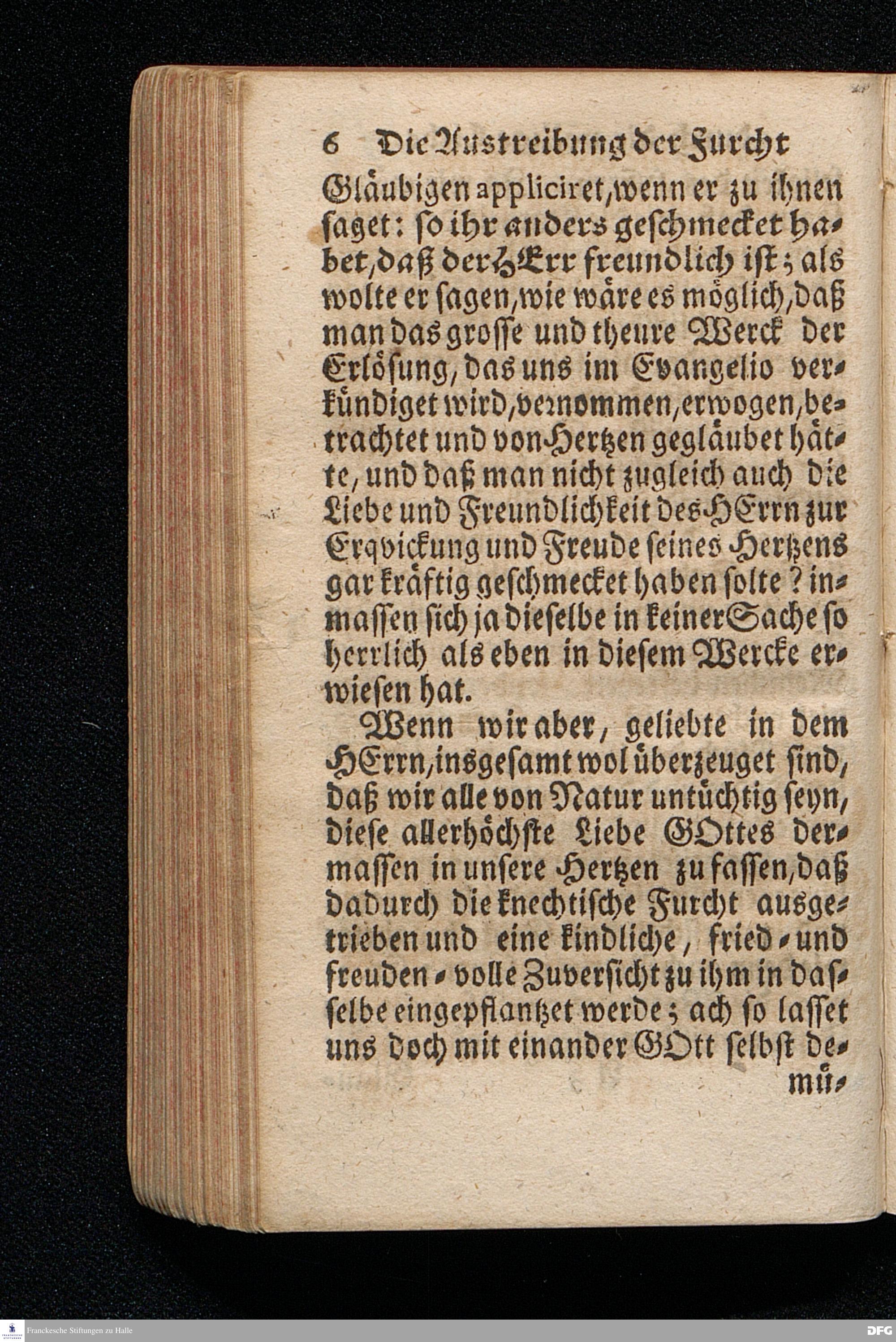 Die Austreibung Der Furcht durch die völlige Liebe, Am I.Sonntag nach Trinitatis 1719. In einer Uber die ordentliche Epistolische Lection aus I.Joh.IV, 16-21. In Der Universitäts=Kirche zu Leipzig auf geschehenen Antrag gehaltenen Predigt vorgestellet, und auf Begehren zum Druck gegeben, Von August Hermann Francken / S.Theol.Prof.& Past.zu St.Ulrich, und des Gymnasii Scholarcha. Andere Auflage. HALLE / In Verlegung des Wäysenhauses / 1723.