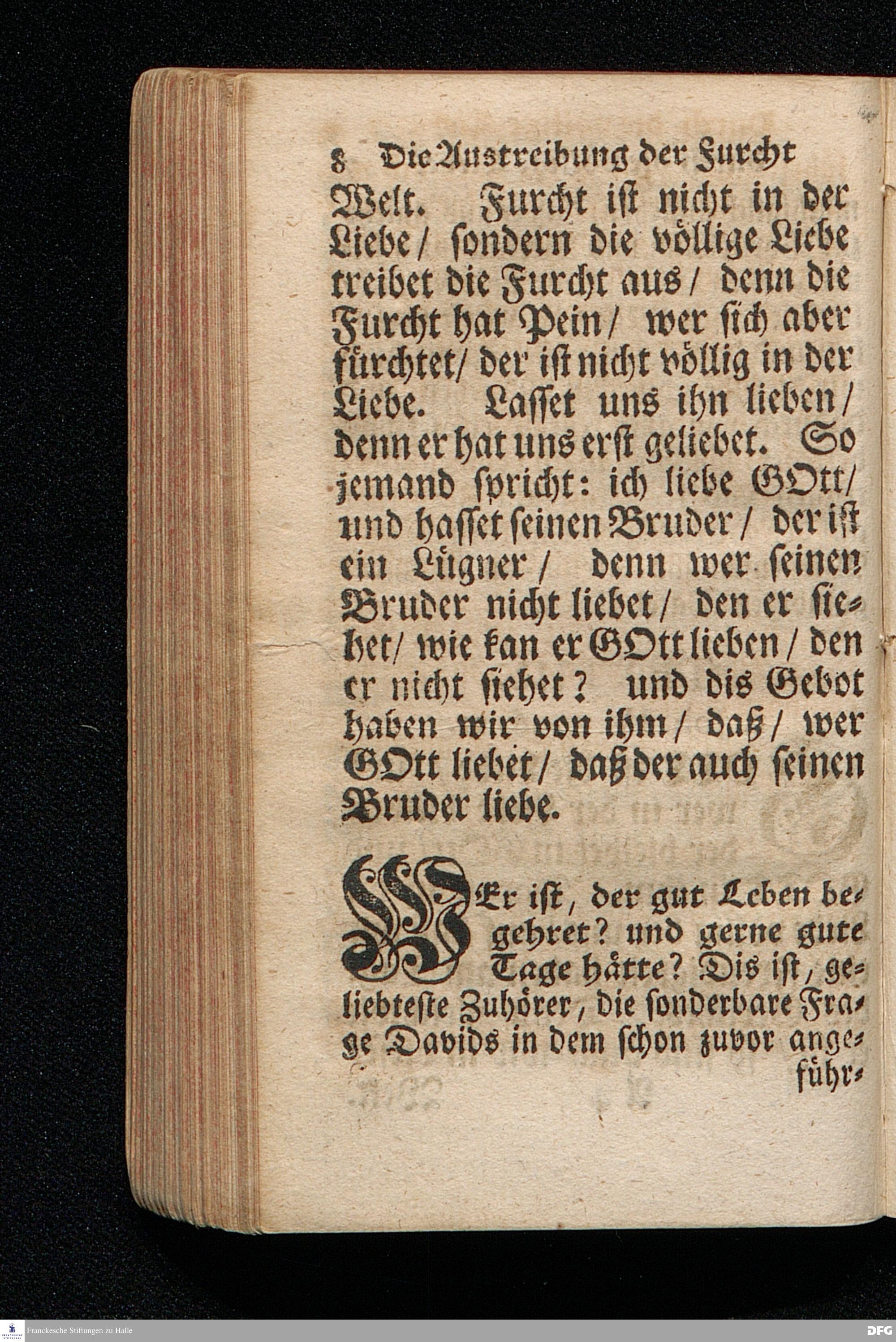 Die Austreibung Der Furcht durch die völlige Liebe, Am I.Sonntag nach Trinitatis 1719. In einer Uber die ordentliche Epistolische Lection aus I.Joh.IV, 16-21. In Der Universitäts=Kirche zu Leipzig auf geschehenen Antrag gehaltenen Predigt vorgestellet, und auf Begehren zum Druck gegeben, Von August Hermann Francken / S.Theol.Prof.& Past.zu St.Ulrich, und des Gymnasii Scholarcha. Andere Auflage. HALLE / In Verlegung des Wäysenhauses / 1723.