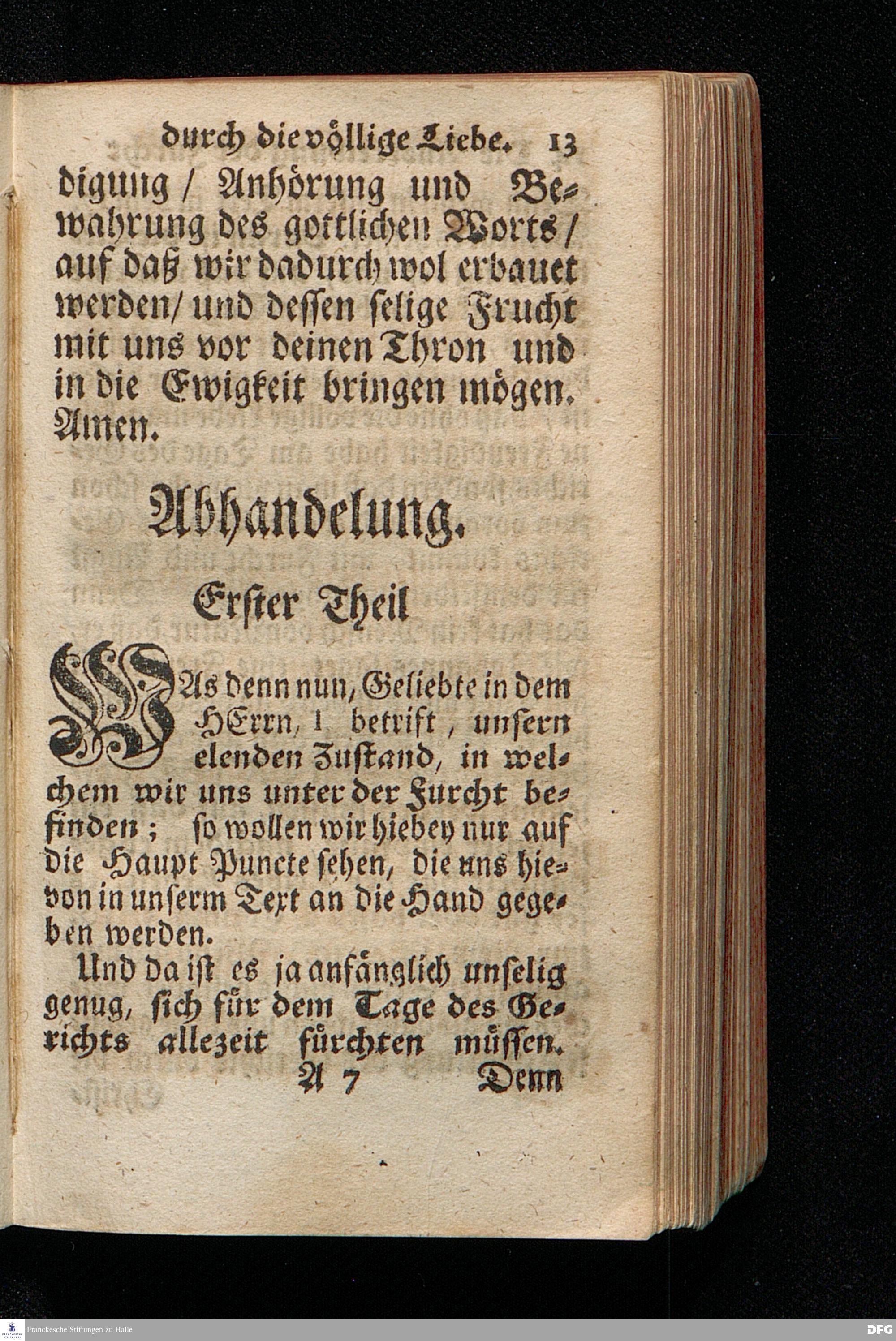 Die Austreibung Der Furcht durch die völlige Liebe, Am I.Sonntag nach Trinitatis 1719. In einer Uber die ordentliche Epistolische Lection aus I.Joh.IV, 16-21. In Der Universitäts=Kirche zu Leipzig auf geschehenen Antrag gehaltenen Predigt vorgestellet, und auf Begehren zum Druck gegeben, Von August Hermann Francken / S.Theol.Prof.& Past.zu St.Ulrich, und des Gymnasii Scholarcha. Andere Auflage. HALLE / In Verlegung des Wäysenhauses / 1723.