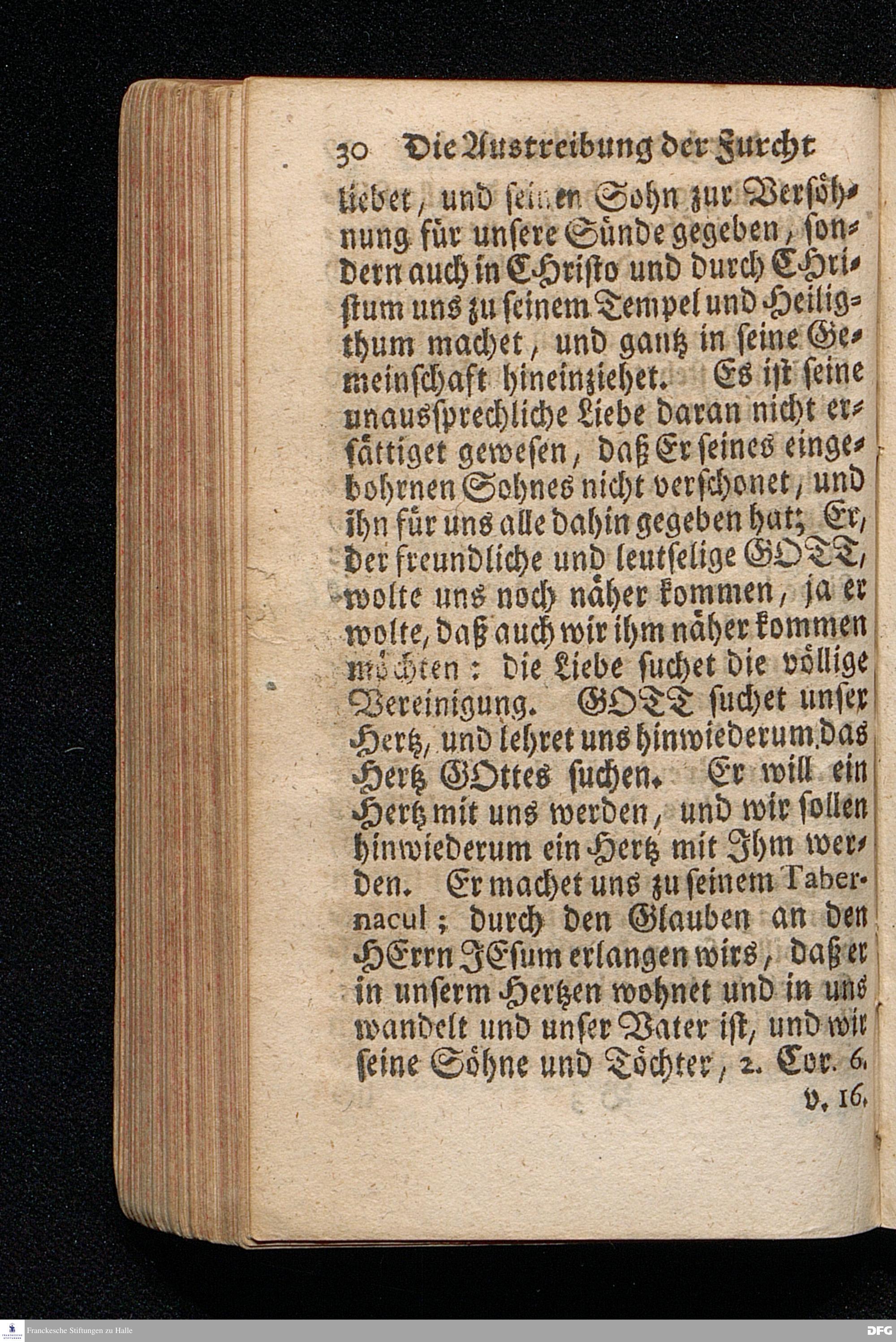 Die Austreibung Der Furcht durch die völlige Liebe, Am I.Sonntag nach Trinitatis 1719. In einer Uber die ordentliche Epistolische Lection aus I.Joh.IV, 16-21. In Der Universitäts=Kirche zu Leipzig auf geschehenen Antrag gehaltenen Predigt vorgestellet, und auf Begehren zum Druck gegeben, Von August Hermann Francken / S.Theol.Prof.& Past.zu St.Ulrich, und des Gymnasii Scholarcha. Andere Auflage. HALLE / In Verlegung des Wäysenhauses / 1723.