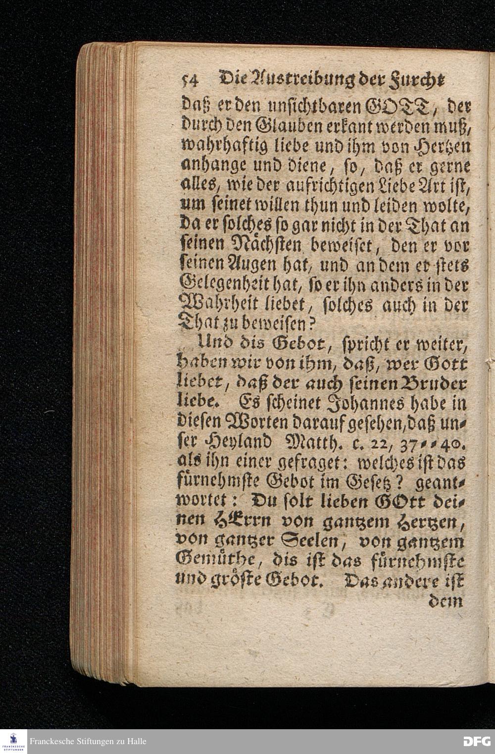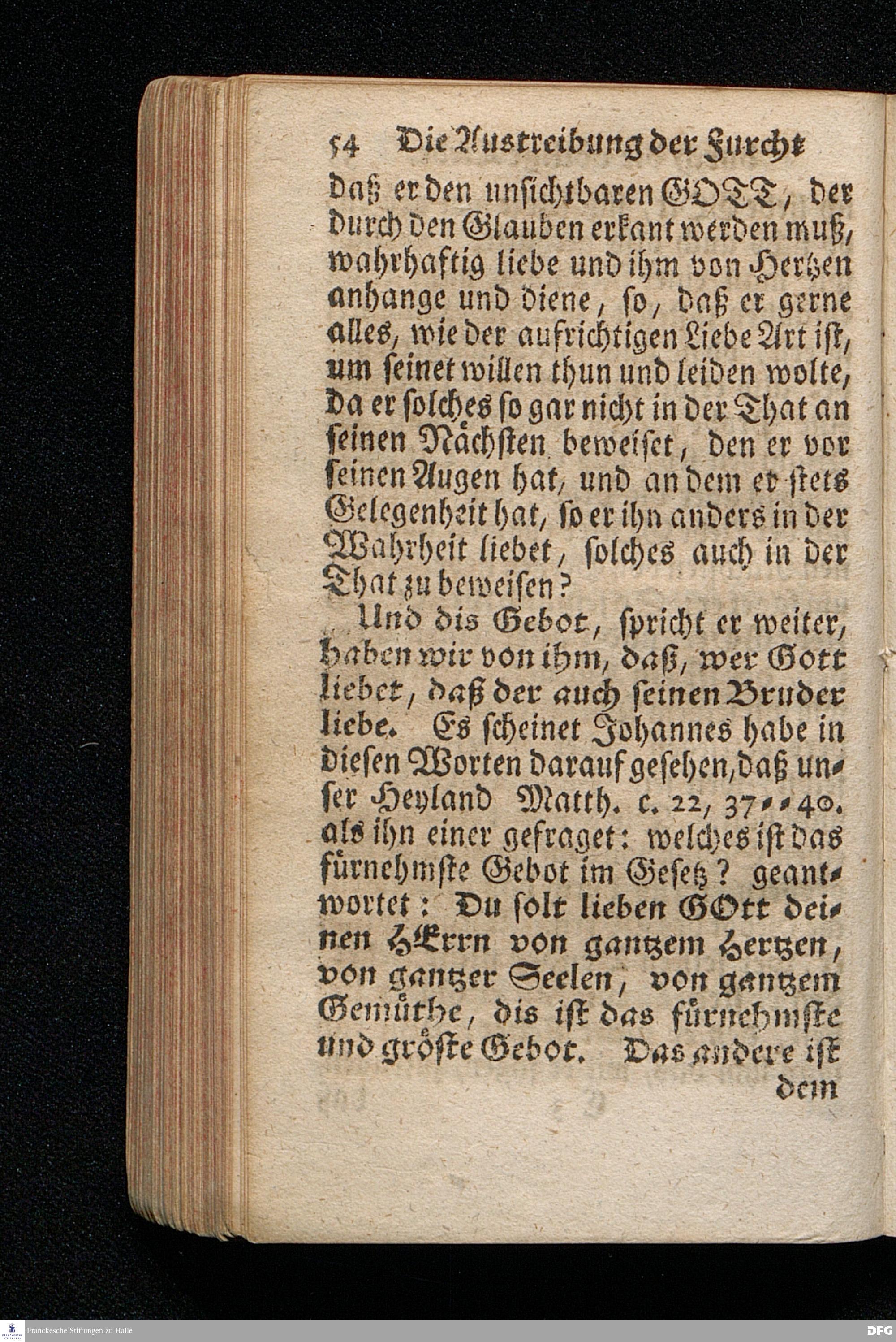 Die Austreibung Der Furcht durch die völlige Liebe, Am I.Sonntag nach Trinitatis 1719. In einer Uber die ordentliche Epistolische Lection aus I.Joh.IV, 16-21. In Der Universitäts=Kirche zu Leipzig auf geschehenen Antrag gehaltenen Predigt vorgestellet, und auf Begehren zum Druck gegeben, Von August Hermann Francken / S.Theol.Prof.& Past.zu St.Ulrich, und des Gymnasii Scholarcha. Andere Auflage. HALLE / In Verlegung des Wäysenhauses / 1723.