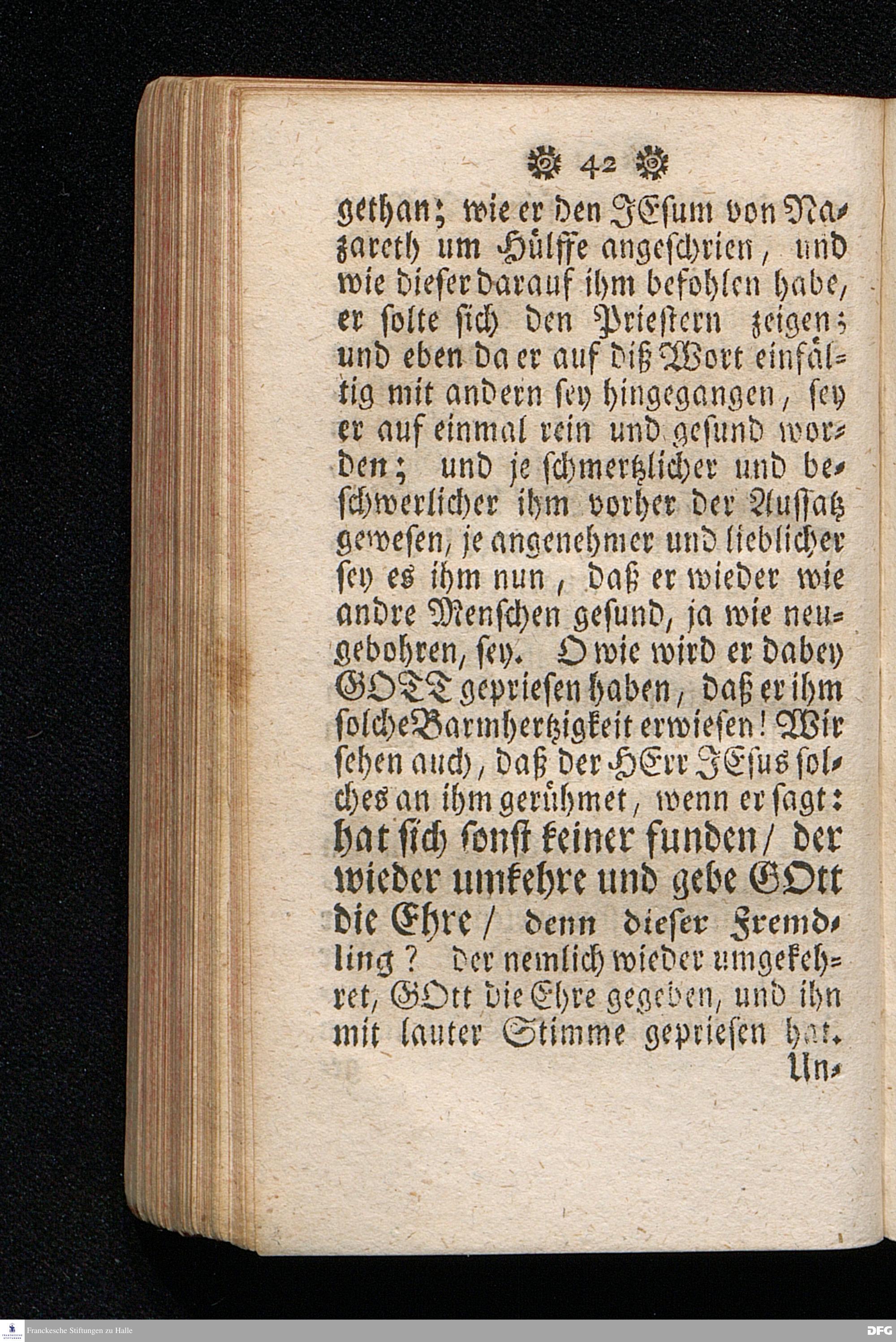 Die Bekehrung Durch Leibliche Trübsal; Wie solche Zwar öffters scheinbar, aber selten rechtschaffen sey / Am XIV.Sonnt.nach Trin. 1719. In einer über das ordentliche Evangelium Luc.XVII, 11-19. In der Guarnison-Kirche der Königl.Preuß.Residentz=Stadt Berl. Auf ergangenen Antrag gehaltenen Predigt vorgetragen, und zum Druck überlassen, Von Aug.Herm.Francken / S.Theol.Prof.& Past.zu St.Ulrich in Halle, und des Gymnasii daselbst Scholarcha. Andere Auflage. BERLIN, in Verlegung des Hallischen Waysenhauses 1723.