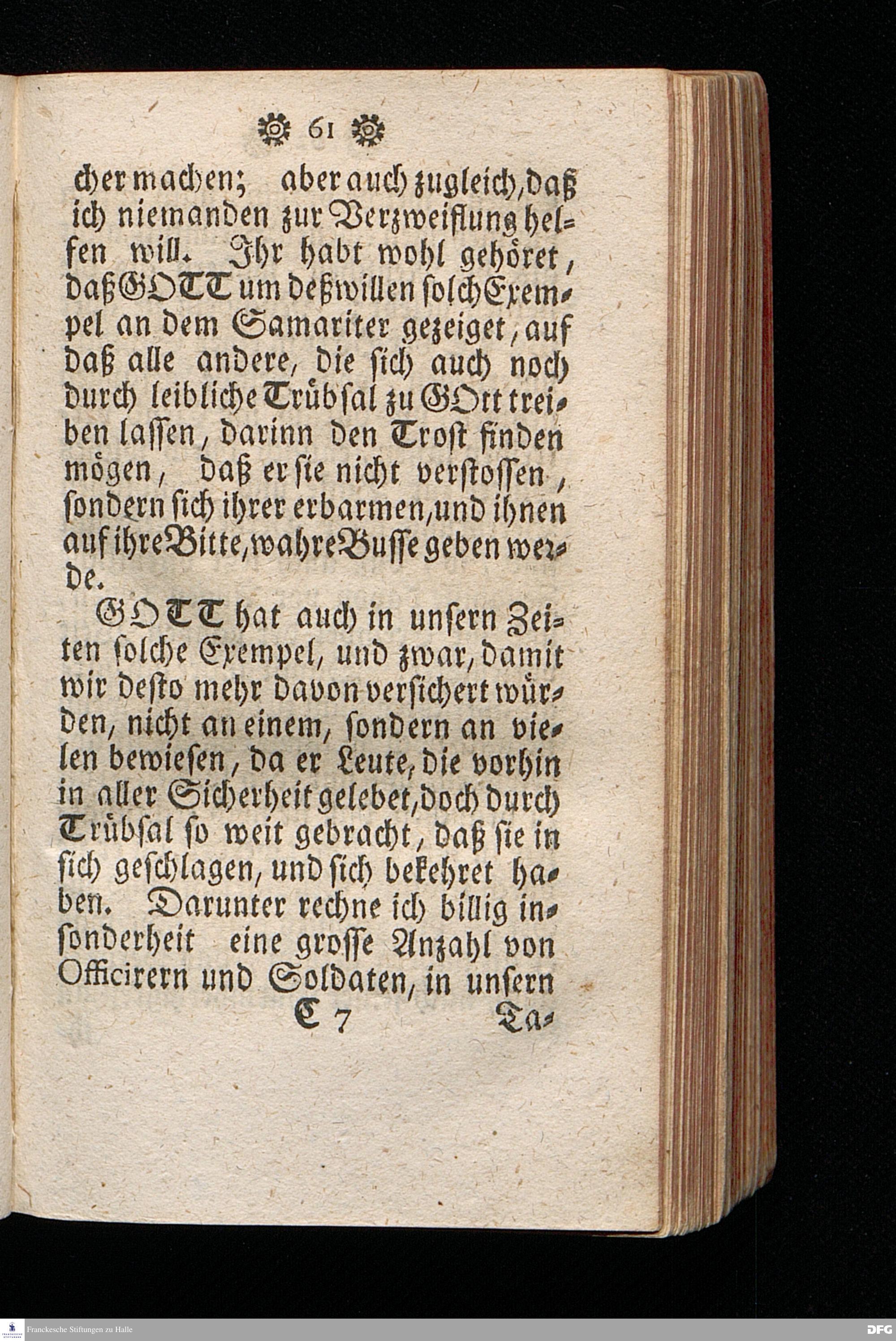 Die Bekehrung Durch Leibliche Trübsal; Wie solche Zwar öffters scheinbar, aber selten rechtschaffen sey / Am XIV.Sonnt.nach Trin. 1719. In einer über das ordentliche Evangelium Luc.XVII, 11-19. In der Guarnison-Kirche der Königl.Preuß.Residentz=Stadt Berl. Auf ergangenen Antrag gehaltenen Predigt vorgetragen, und zum Druck überlassen, Von Aug.Herm.Francken / S.Theol.Prof.& Past.zu St.Ulrich in Halle, und des Gymnasii daselbst Scholarcha. Andere Auflage. BERLIN, in Verlegung des Hallischen Waysenhauses 1723.