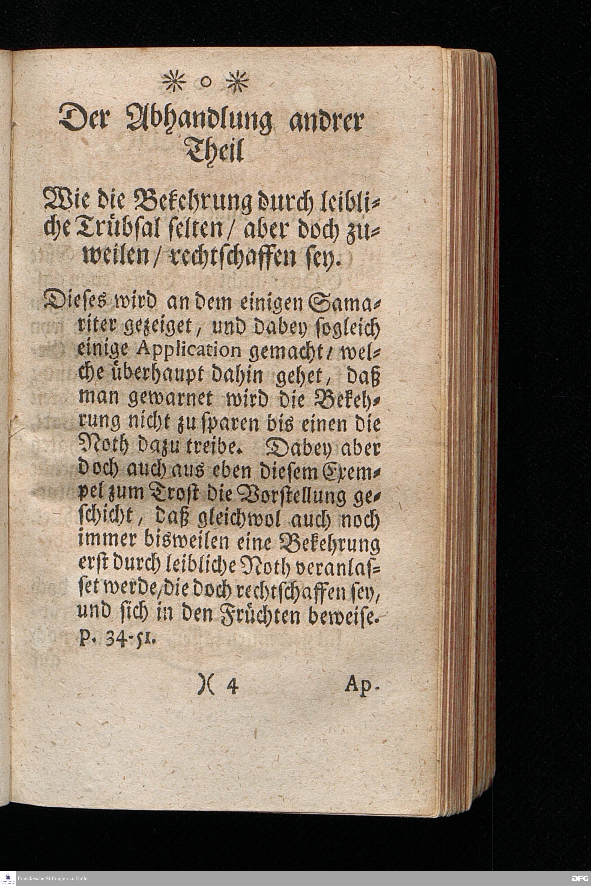 Die Bekehrung Durch Leibliche Trübsal; Wie solche Zwar öffters scheinbar, aber selten rechtschaffen sey / Am XIV.Sonnt.nach Trin. 1719. In einer über das ordentliche Evangelium Luc.XVII, 11-19. In der Guarnison-Kirche der Königl.Preuß.Residentz=Stadt Berl. Auf ergangenen Antrag gehaltenen Predigt vorgetragen, und zum Druck überlassen, Von Aug.Herm.Francken / S.Theol.Prof.& Past.zu St.Ulrich in Halle, und des Gymnasii daselbst Scholarcha. Andere Auflage. BERLIN, in Verlegung des Hallischen Waysenhauses 1723.