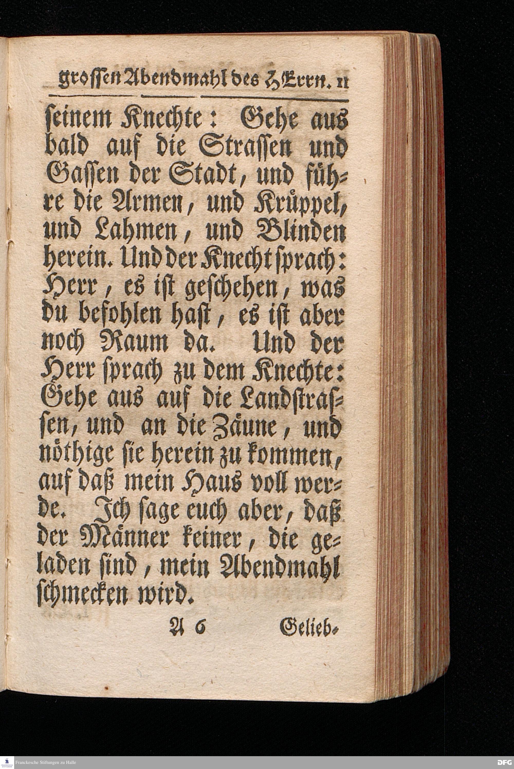 Der Beruf Zu dem Grossen Abendmahl des HERRN / Am 2.Sonntage nach Trinitatis 1720. In einer über den ordentlichen Evangel.Text Luc.XIV, 16--24. In der Kirche zu St.Nicolai der Königl.Residenz Stadt Berlin auf Erforderung gehaltenen Predigt vorgestellet / und nach Begehren zum Druck gegeben von August Hermann Francken, S.Theol.Prof.Past.zu St.Ulrich, und des Gymnasii Scholarcha. Andere Auflage. Der Schul=Jugend in den Glauchischen Anstalten nach gehaltenem Examine ausgetheilet den 20ten Julii 1720. HALLE / In Verlegung des Wäysenhauses. MDCCXXIII.