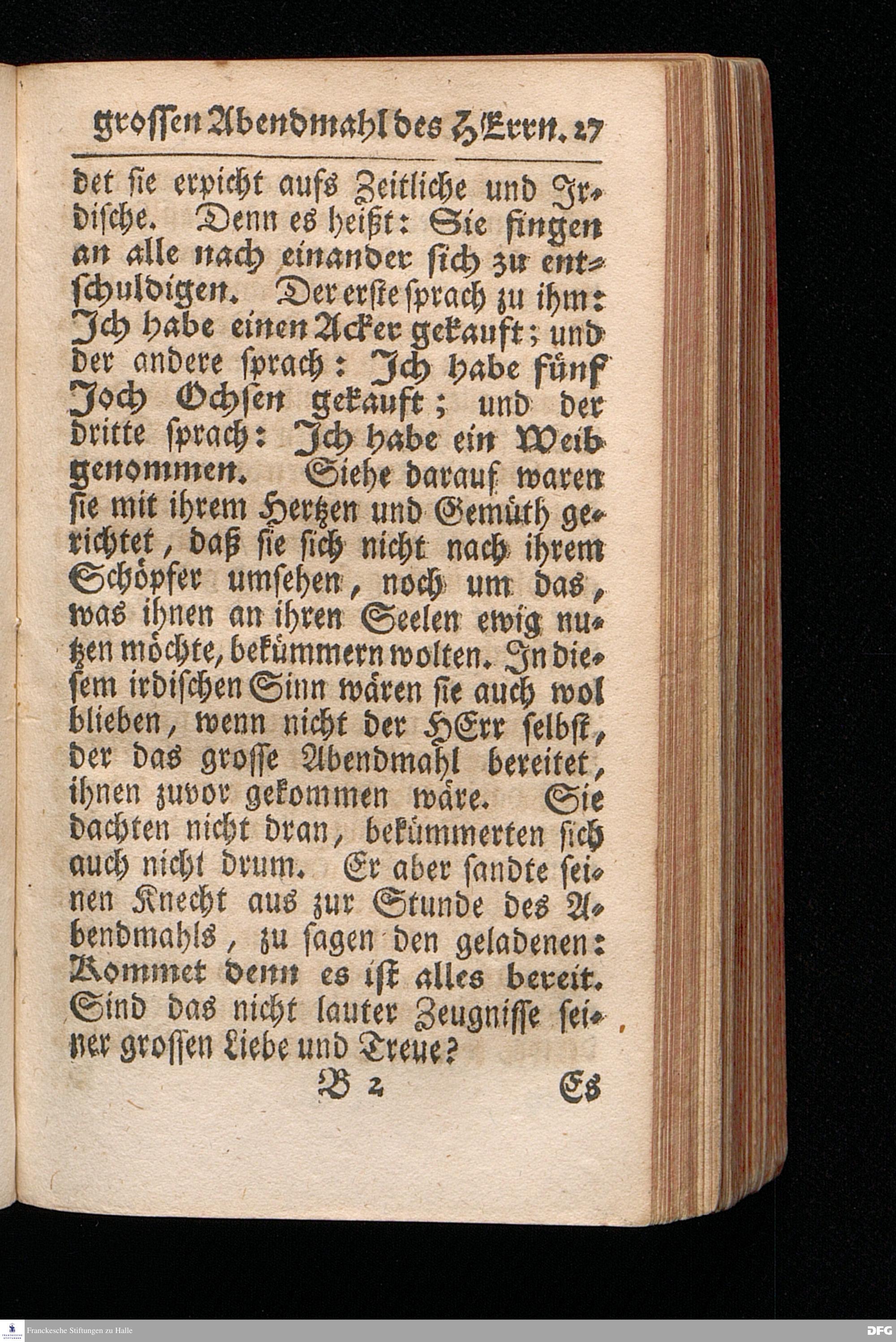 Der Beruf Zu dem Grossen Abendmahl des HERRN / Am 2.Sonntage nach Trinitatis 1720. In einer über den ordentlichen Evangel.Text Luc.XIV, 16--24. In der Kirche zu St.Nicolai der Königl.Residenz Stadt Berlin auf Erforderung gehaltenen Predigt vorgestellet / und nach Begehren zum Druck gegeben von August Hermann Francken, S.Theol.Prof.Past.zu St.Ulrich, und des Gymnasii Scholarcha. Andere Auflage. Der Schul=Jugend in den Glauchischen Anstalten nach gehaltenem Examine ausgetheilet den 20ten Julii 1720. HALLE / In Verlegung des Wäysenhauses. MDCCXXIII.