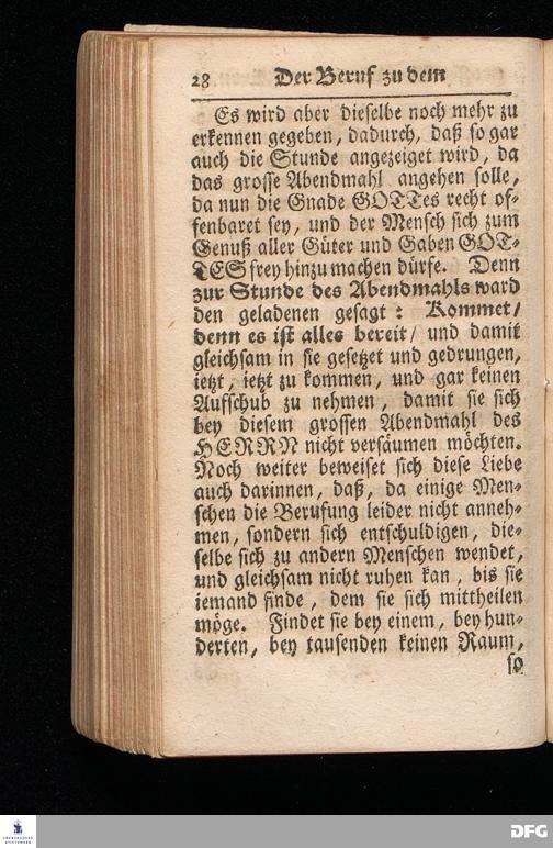 Der Beruf Zu dem Grossen Abendmahl des HERRN / Am 2.Sonntage nach Trinitatis 1720. In einer über den ordentlichen Evangel.Text Luc.XIV, 16--24. In der Kirche zu St.Nicolai der Königl.Residenz Stadt Berlin auf Erforderung gehaltenen Predigt vorgestellet / und nach Begehren zum Druck gegeben von August Hermann Francken, S.Theol.Prof.Past.zu St.Ulrich, und des Gymnasii Scholarcha. Andere Auflage. Der Schul=Jugend in den Glauchischen Anstalten nach gehaltenem Examine ausgetheilet den 20ten Julii 1720. HALLE / In Verlegung des Wäysenhauses. MDCCXXIII.