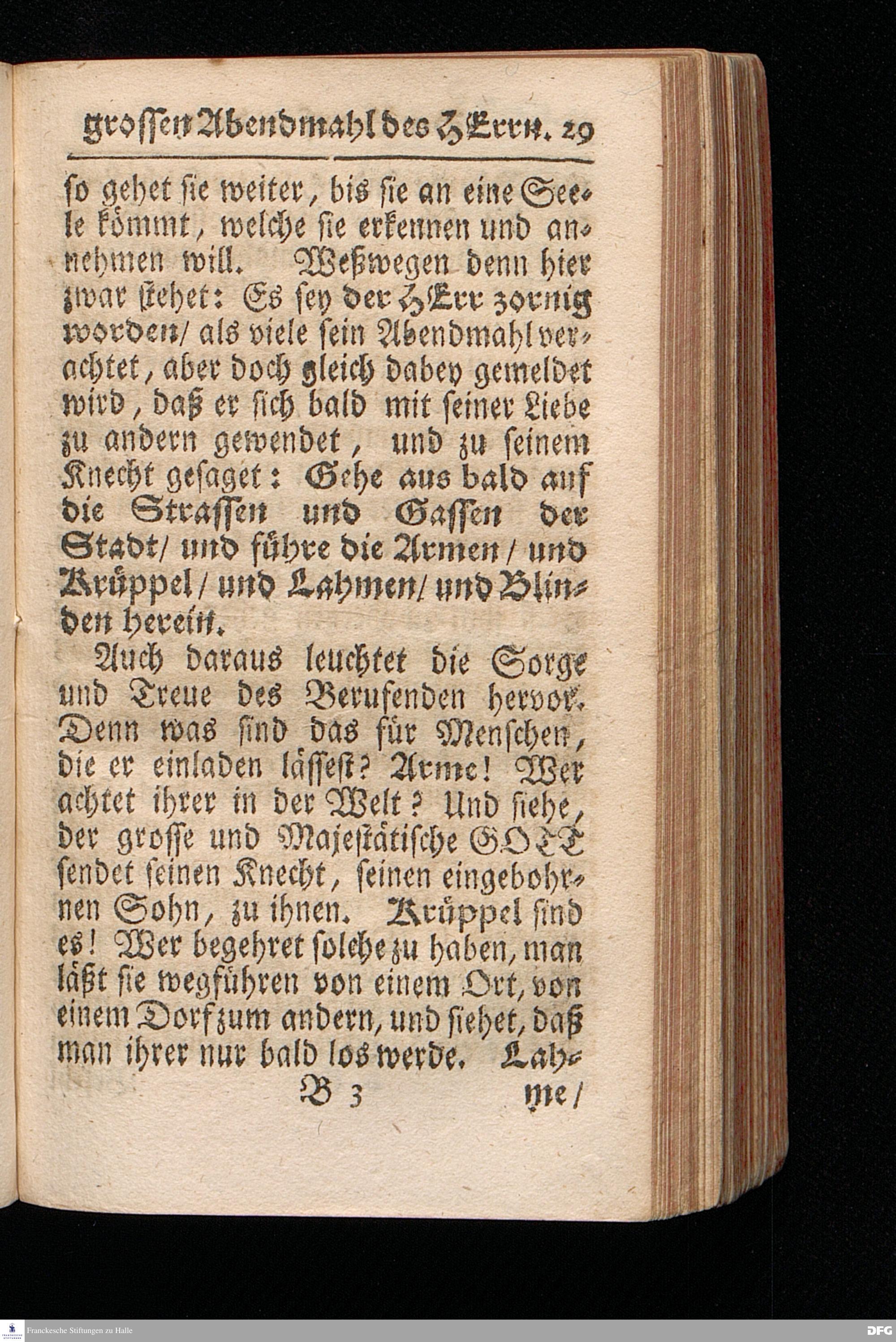 Der Beruf Zu dem Grossen Abendmahl des HERRN / Am 2.Sonntage nach Trinitatis 1720. In einer über den ordentlichen Evangel.Text Luc.XIV, 16--24. In der Kirche zu St.Nicolai der Königl.Residenz Stadt Berlin auf Erforderung gehaltenen Predigt vorgestellet / und nach Begehren zum Druck gegeben von August Hermann Francken, S.Theol.Prof.Past.zu St.Ulrich, und des Gymnasii Scholarcha. Andere Auflage. Der Schul=Jugend in den Glauchischen Anstalten nach gehaltenem Examine ausgetheilet den 20ten Julii 1720. HALLE / In Verlegung des Wäysenhauses. MDCCXXIII.