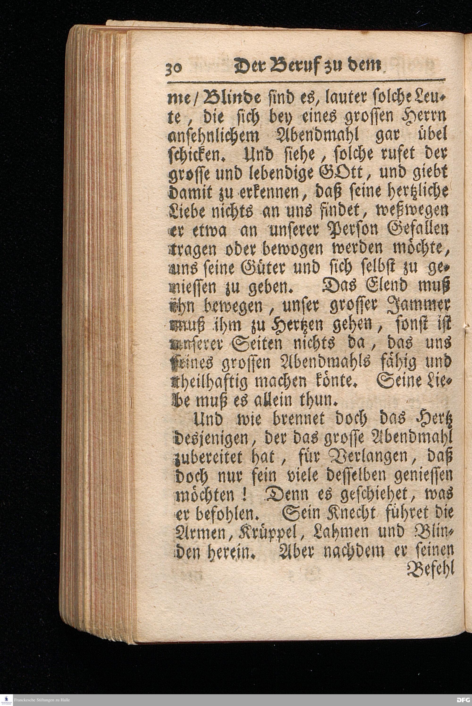 Der Beruf Zu dem Grossen Abendmahl des HERRN / Am 2.Sonntage nach Trinitatis 1720. In einer über den ordentlichen Evangel.Text Luc.XIV, 16--24. In der Kirche zu St.Nicolai der Königl.Residenz Stadt Berlin auf Erforderung gehaltenen Predigt vorgestellet / und nach Begehren zum Druck gegeben von August Hermann Francken, S.Theol.Prof.Past.zu St.Ulrich, und des Gymnasii Scholarcha. Andere Auflage. Der Schul=Jugend in den Glauchischen Anstalten nach gehaltenem Examine ausgetheilet den 20ten Julii 1720. HALLE / In Verlegung des Wäysenhauses. MDCCXXIII.