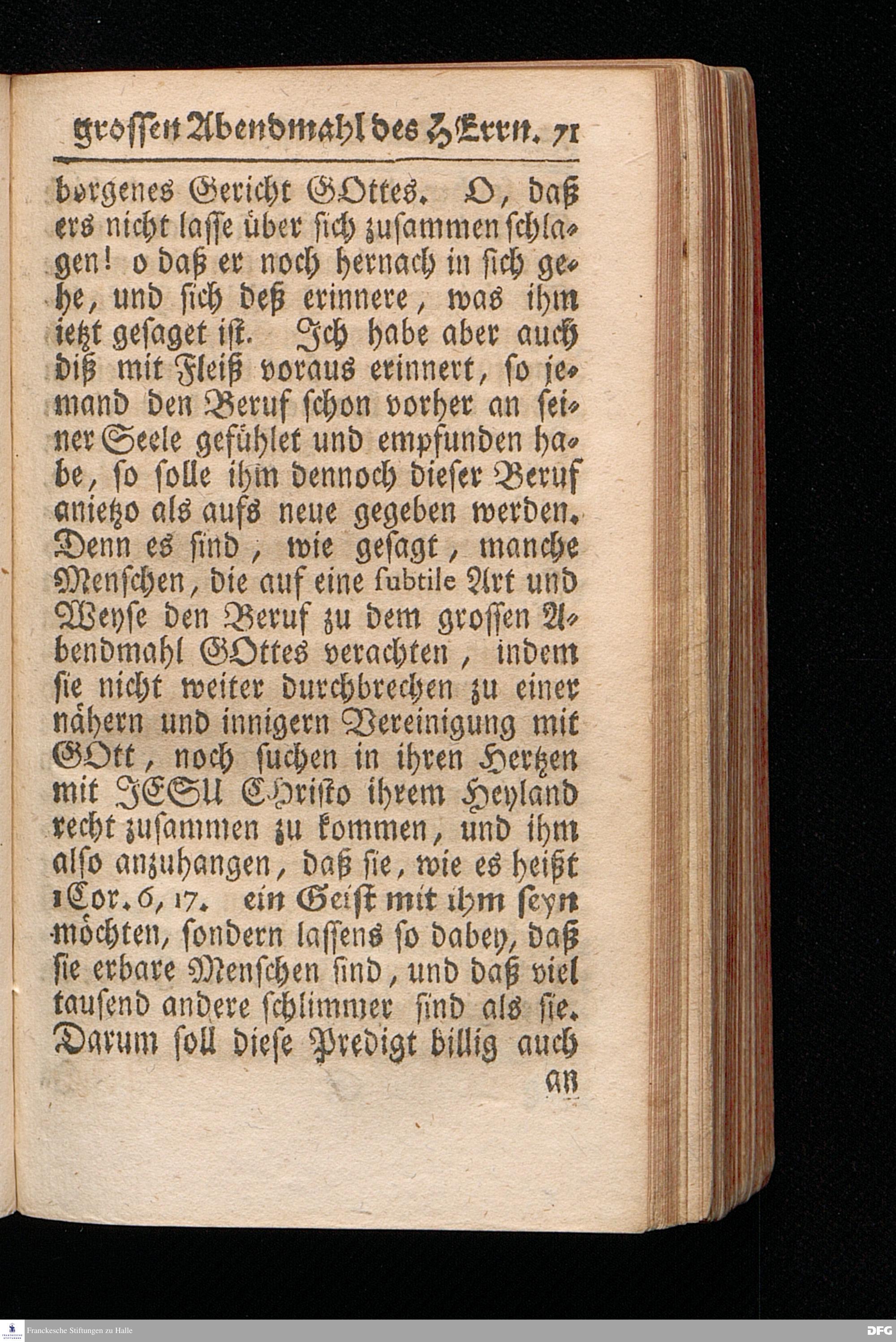 Der Beruf Zu dem Grossen Abendmahl des HERRN / Am 2.Sonntage nach Trinitatis 1720. In einer über den ordentlichen Evangel.Text Luc.XIV, 16--24. In der Kirche zu St.Nicolai der Königl.Residenz Stadt Berlin auf Erforderung gehaltenen Predigt vorgestellet / und nach Begehren zum Druck gegeben von August Hermann Francken, S.Theol.Prof.Past.zu St.Ulrich, und des Gymnasii Scholarcha. Andere Auflage. Der Schul=Jugend in den Glauchischen Anstalten nach gehaltenem Examine ausgetheilet den 20ten Julii 1720. HALLE / In Verlegung des Wäysenhauses. MDCCXXIII.