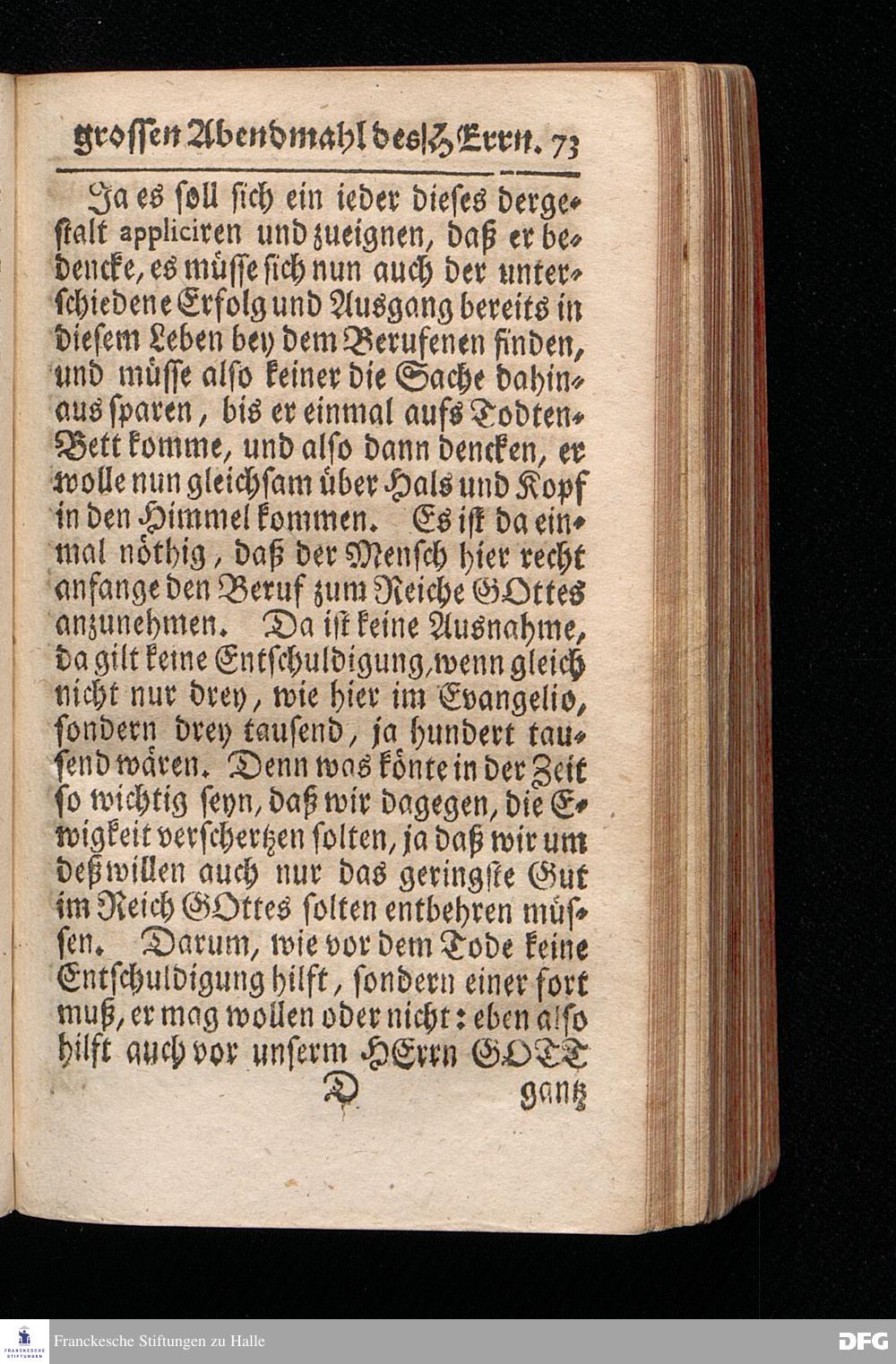 Der Beruf Zu dem Grossen Abendmahl des HERRN / Am 2.Sonntage nach Trinitatis 1720. In einer über den ordentlichen Evangel.Text Luc.XIV, 16--24. In der Kirche zu St.Nicolai der Königl.Residenz Stadt Berlin auf Erforderung gehaltenen Predigt vorgestellet / und nach Begehren zum Druck gegeben von August Hermann Francken, S.Theol.Prof.Past.zu St.Ulrich, und des Gymnasii Scholarcha. Andere Auflage. Der Schul=Jugend in den Glauchischen Anstalten nach gehaltenem Examine ausgetheilet den 20ten Julii 1720. HALLE / In Verlegung des Wäysenhauses. MDCCXXIII.