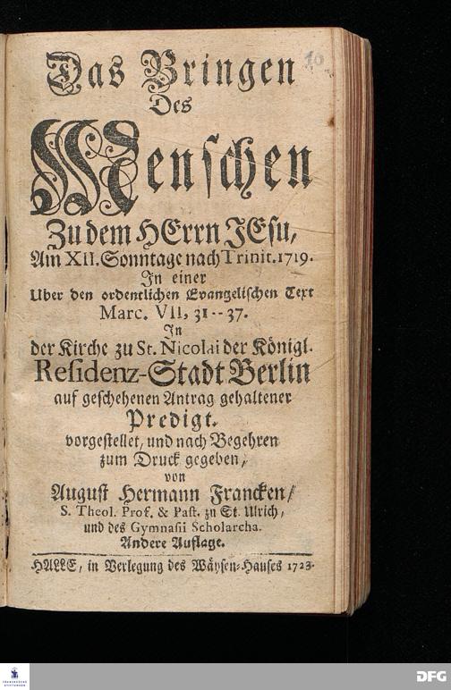 Das Bringen Des Menschen Zu dem HErrn JEsu, Am XII.Sonntage nach Trinit.1719. In einer Uber den ordentlichen Evangelischen Text Marc.VII, 31--37. In der Kirche zu St.Nicolai der Königl. Residenz-Stadt Berlin auf geschehenen Antrag gehaltener Predigt. vorgestellet, und nach Begehren zum Druck gegeben, von August Hermann Francken / S.Theol.Prof.& Past.zu St.Ulrich, und des Gymnasii Scholarcha. Andere Auflage. HALLE, in Verlegung des Wäysen=Hauses 1723.
