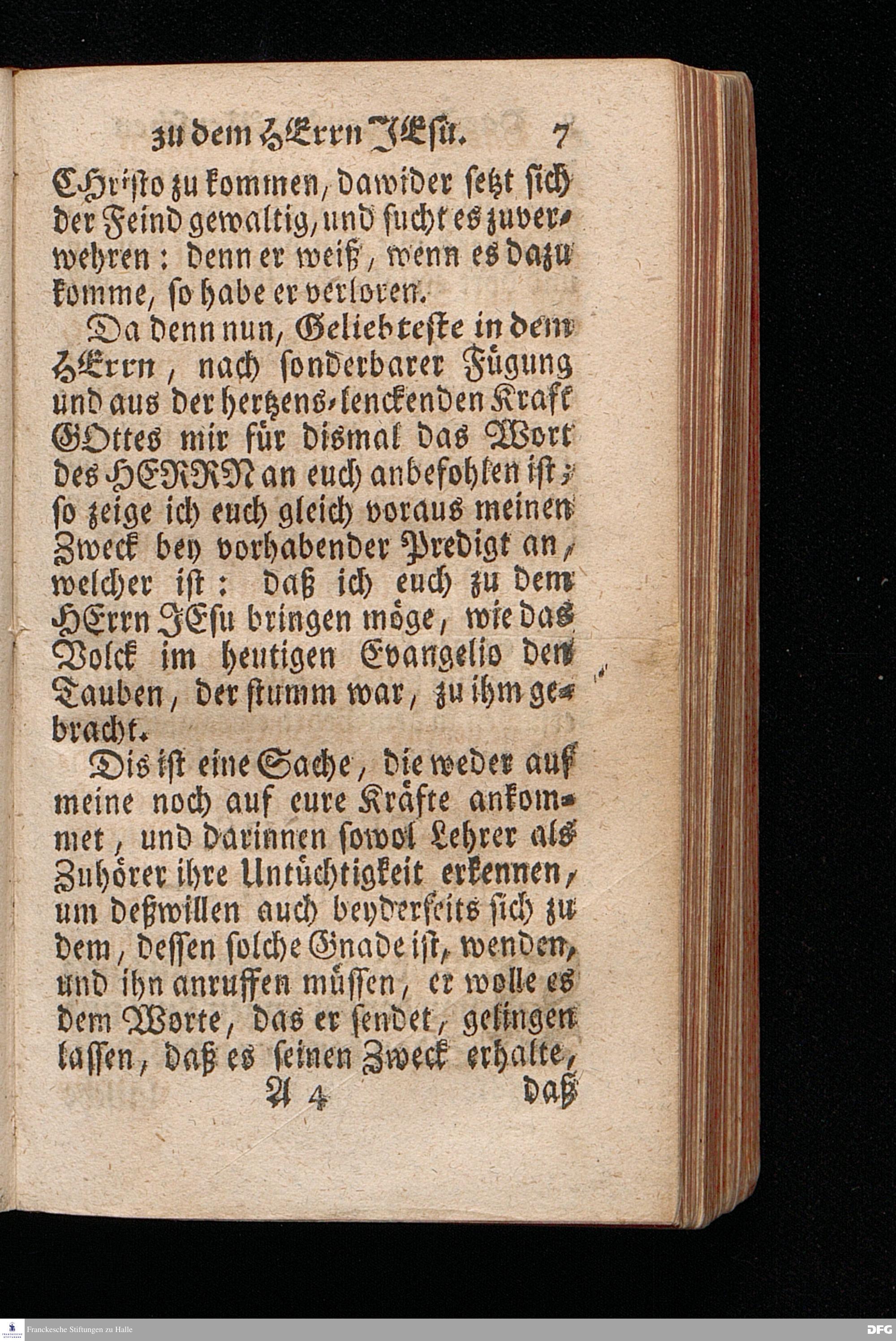 Das Bringen Des Menschen Zu dem HErrn JEsu, Am XII.Sonntage nach Trinit.1719. In einer Uber den ordentlichen Evangelischen Text Marc.VII, 31--37. In der Kirche zu St.Nicolai der Königl. Residenz-Stadt Berlin auf geschehenen Antrag gehaltener Predigt. vorgestellet, und nach Begehren zum Druck gegeben, von August Hermann Francken / S.Theol.Prof.& Past.zu St.Ulrich, und des Gymnasii Scholarcha. Andere Auflage. HALLE, in Verlegung des Wäysen=Hauses 1723.