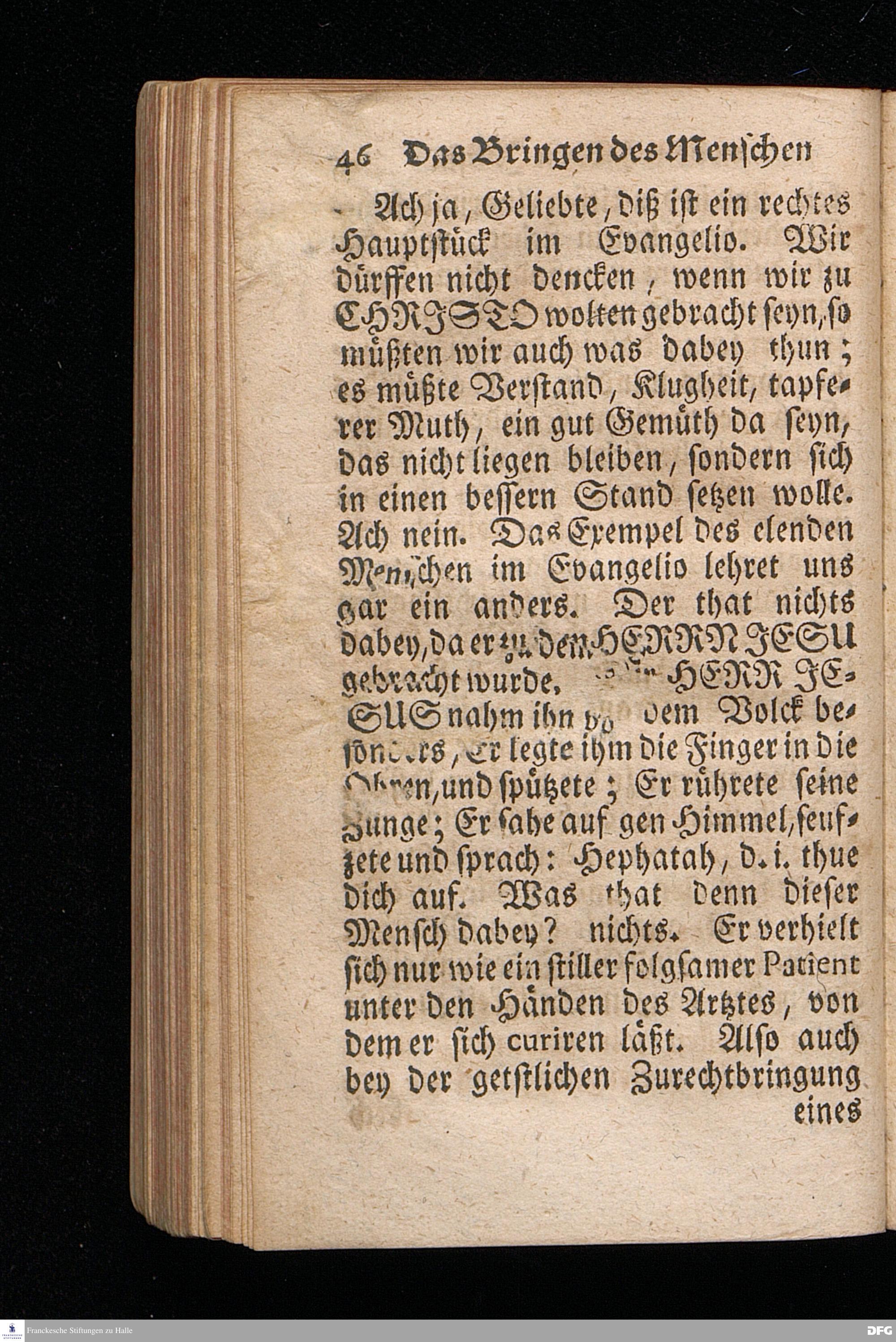 Das Bringen Des Menschen Zu dem HErrn JEsu, Am XII.Sonntage nach Trinit.1719. In einer Uber den ordentlichen Evangelischen Text Marc.VII, 31--37. In der Kirche zu St.Nicolai der Königl. Residenz-Stadt Berlin auf geschehenen Antrag gehaltener Predigt. vorgestellet, und nach Begehren zum Druck gegeben, von August Hermann Francken / S.Theol.Prof.& Past.zu St.Ulrich, und des Gymnasii Scholarcha. Andere Auflage. HALLE, in Verlegung des Wäysen=Hauses 1723.