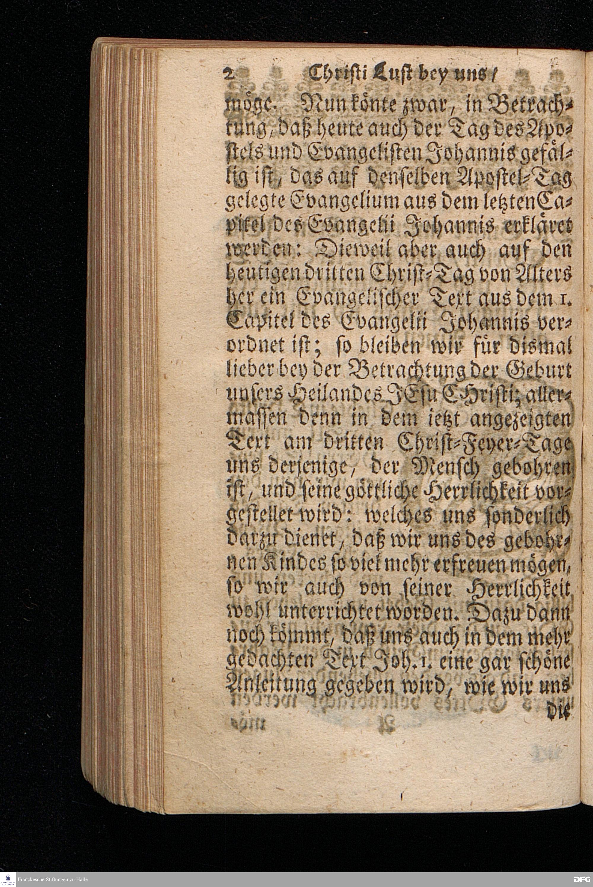 Christi Lust bey uns / und Unsere Lust bey Christo / Am III.Christ=Tage An.1717. In einer Uber den ordentlichen Evangelischen Text Joh.I, 1--14. In der Stadt=Kirchen zu Blaubeuren im Hertzogthum Würtemberg, Auf Erfordern Sr.Hochwürden des ietzigen Herrn Prälaten und gantzen Ministerii daselbst, gehaltenen Und auf Verlangen in den Druck gegebenen Predigt vorgestellet von August Hermann Francken / S.Theol.Prof.Past.und Scholarcha zu Halle im Hertzogthum Magdeburg. HALLE, Gedruckt im Wäysen=Hause. Anno 1718.
