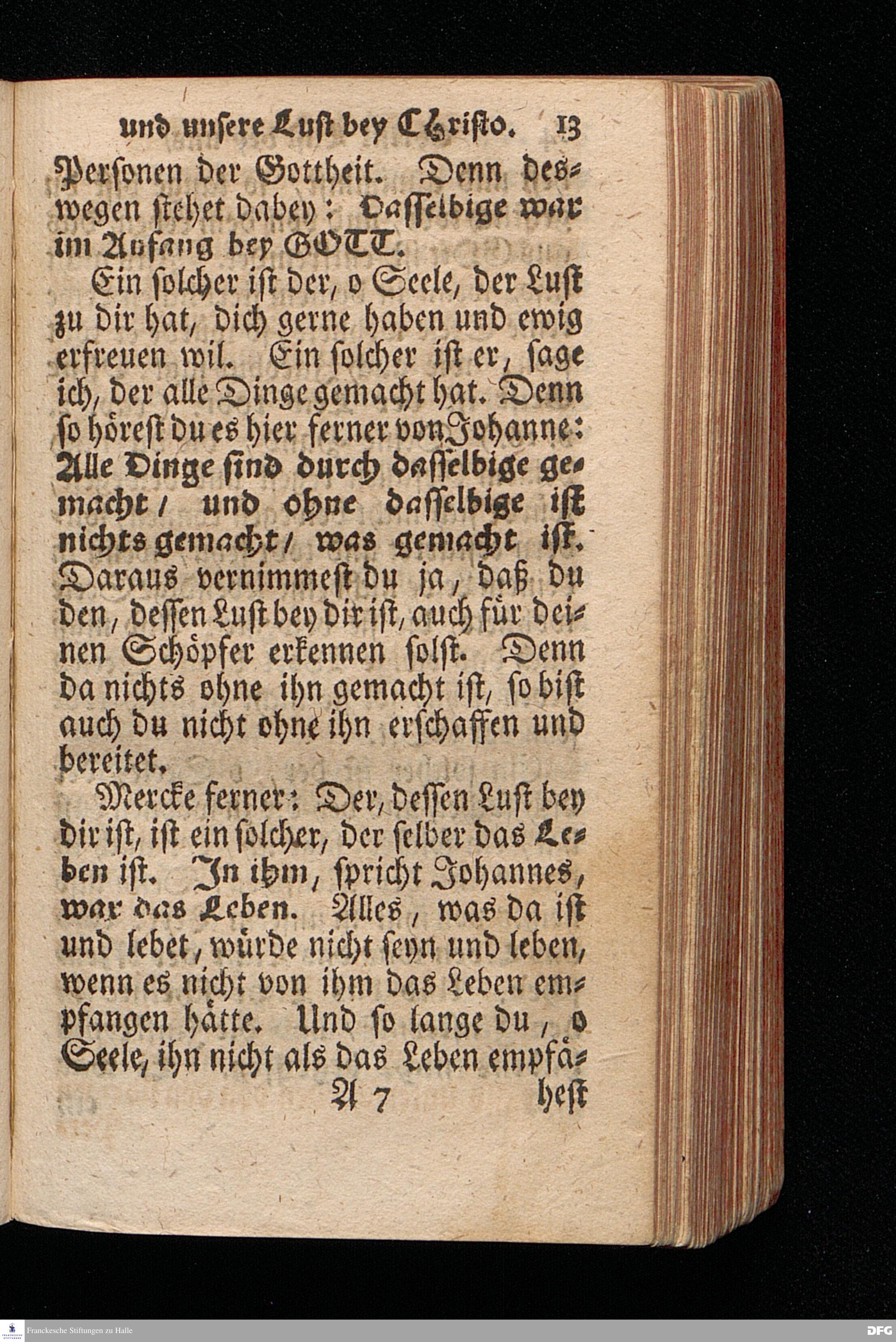 Christi Lust bey uns / und Unsere Lust bey Christo / Am III.Christ=Tage An.1717. In einer Uber den ordentlichen Evangelischen Text Joh.I, 1--14. In der Stadt=Kirchen zu Blaubeuren im Hertzogthum Würtemberg, Auf Erfordern Sr.Hochwürden des ietzigen Herrn Prälaten und gantzen Ministerii daselbst, gehaltenen Und auf Verlangen in den Druck gegebenen Predigt vorgestellet von August Hermann Francken / S.Theol.Prof.Past.und Scholarcha zu Halle im Hertzogthum Magdeburg. HALLE, Gedruckt im Wäysen=Hause. Anno 1718.