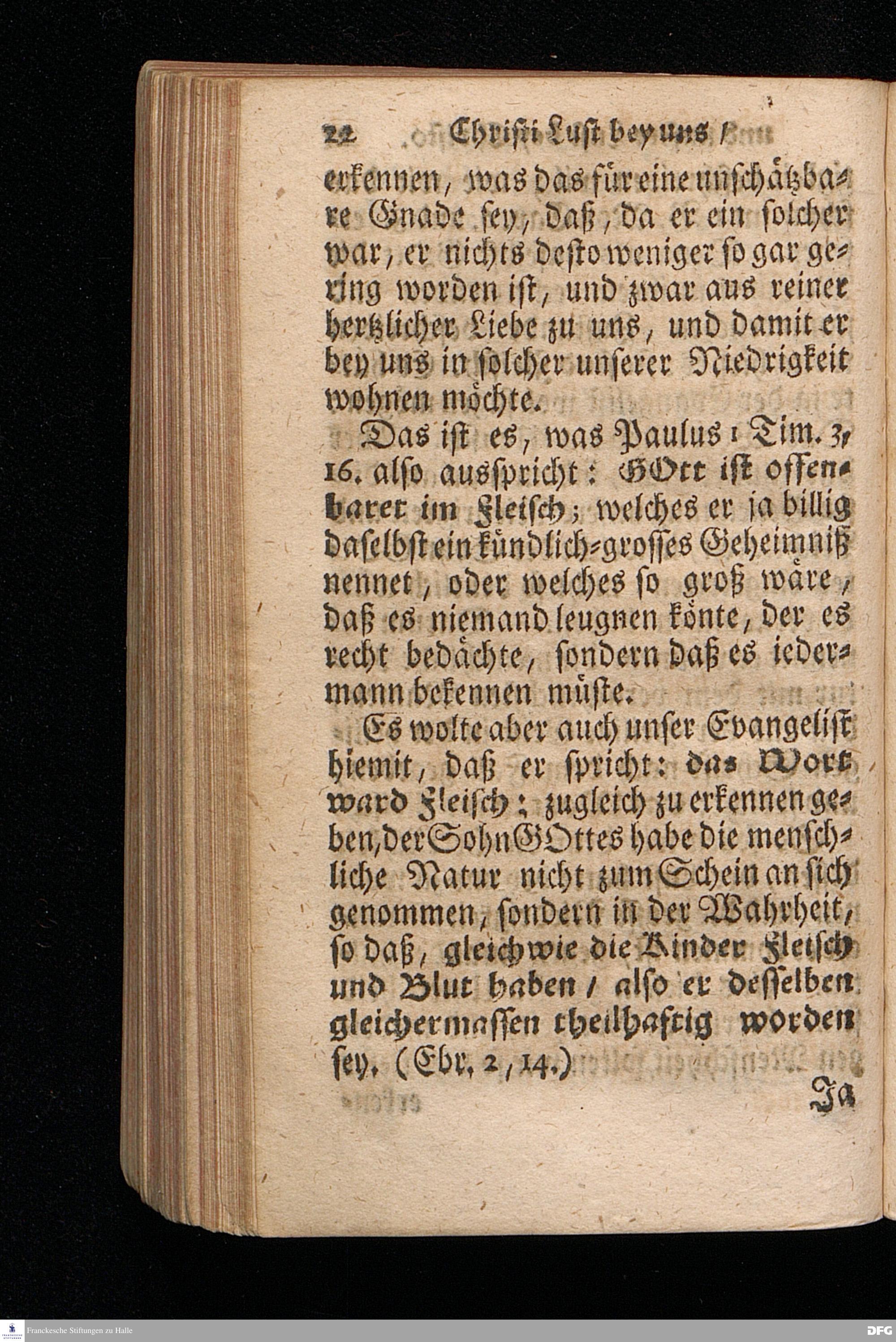 Christi Lust bey uns / und Unsere Lust bey Christo / Am III.Christ=Tage An.1717. In einer Uber den ordentlichen Evangelischen Text Joh.I, 1--14. In der Stadt=Kirchen zu Blaubeuren im Hertzogthum Würtemberg, Auf Erfordern Sr.Hochwürden des ietzigen Herrn Prälaten und gantzen Ministerii daselbst, gehaltenen Und auf Verlangen in den Druck gegebenen Predigt vorgestellet von August Hermann Francken / S.Theol.Prof.Past.und Scholarcha zu Halle im Hertzogthum Magdeburg. HALLE, Gedruckt im Wäysen=Hause. Anno 1718.