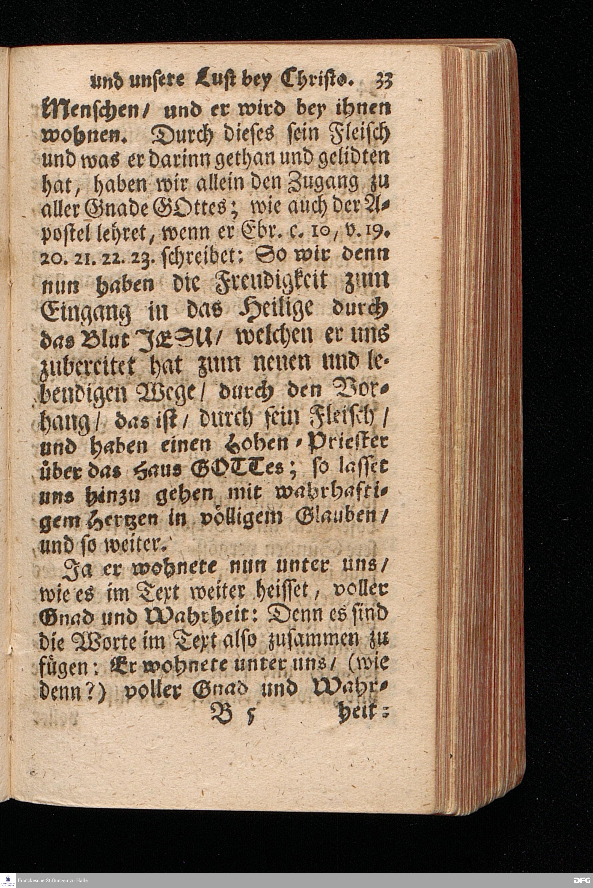 Christi Lust bey uns / und Unsere Lust bey Christo / Am III.Christ=Tage An.1717. In einer Uber den ordentlichen Evangelischen Text Joh.I, 1--14. In der Stadt=Kirchen zu Blaubeuren im Hertzogthum Würtemberg, Auf Erfordern Sr.Hochwürden des ietzigen Herrn Prälaten und gantzen Ministerii daselbst, gehaltenen Und auf Verlangen in den Druck gegebenen Predigt vorgestellet von August Hermann Francken / S.Theol.Prof.Past.und Scholarcha zu Halle im Hertzogthum Magdeburg. HALLE, Gedruckt im Wäysen=Hause. Anno 1718.