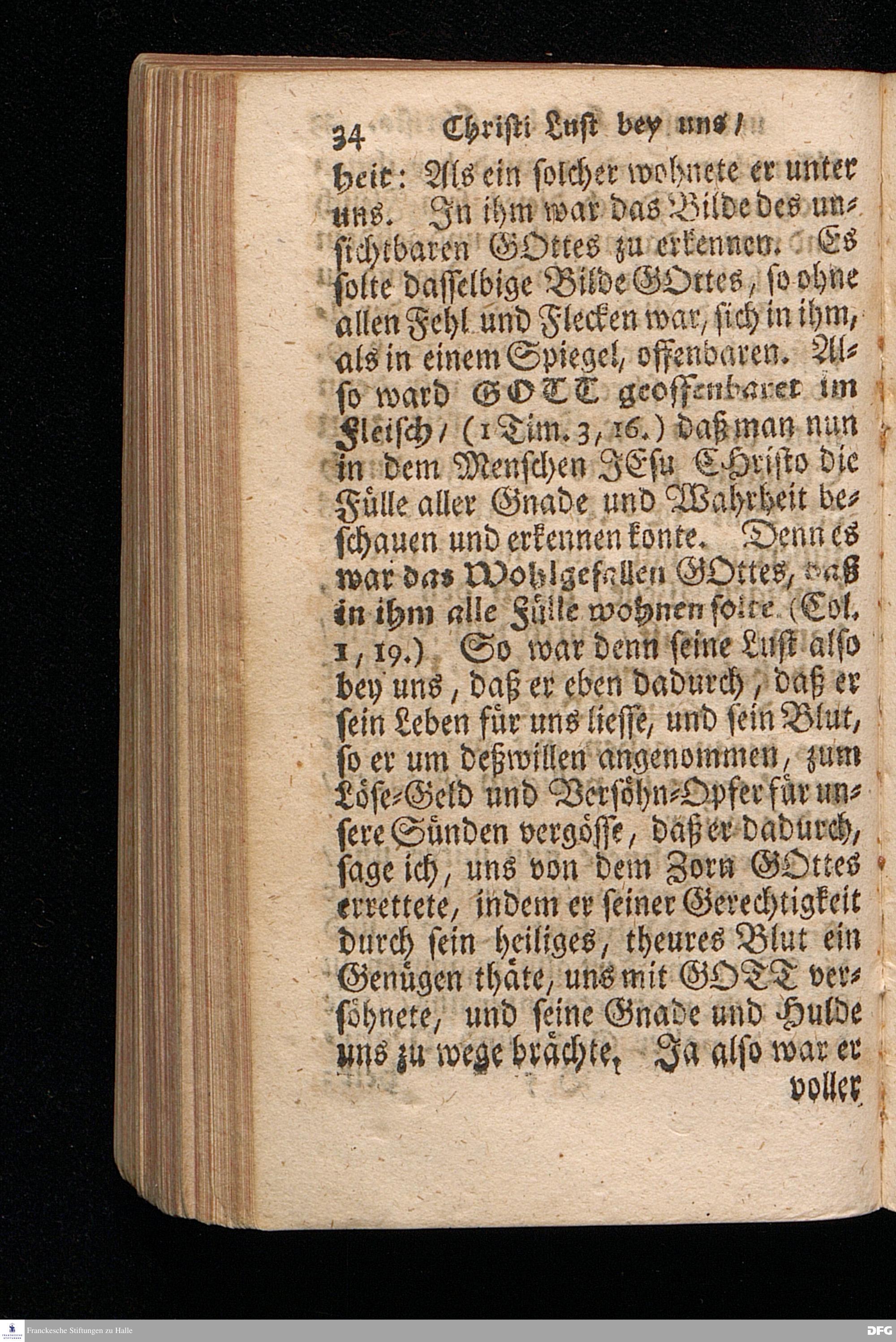 Christi Lust bey uns / und Unsere Lust bey Christo / Am III.Christ=Tage An.1717. In einer Uber den ordentlichen Evangelischen Text Joh.I, 1--14. In der Stadt=Kirchen zu Blaubeuren im Hertzogthum Würtemberg, Auf Erfordern Sr.Hochwürden des ietzigen Herrn Prälaten und gantzen Ministerii daselbst, gehaltenen Und auf Verlangen in den Druck gegebenen Predigt vorgestellet von August Hermann Francken / S.Theol.Prof.Past.und Scholarcha zu Halle im Hertzogthum Magdeburg. HALLE, Gedruckt im Wäysen=Hause. Anno 1718.