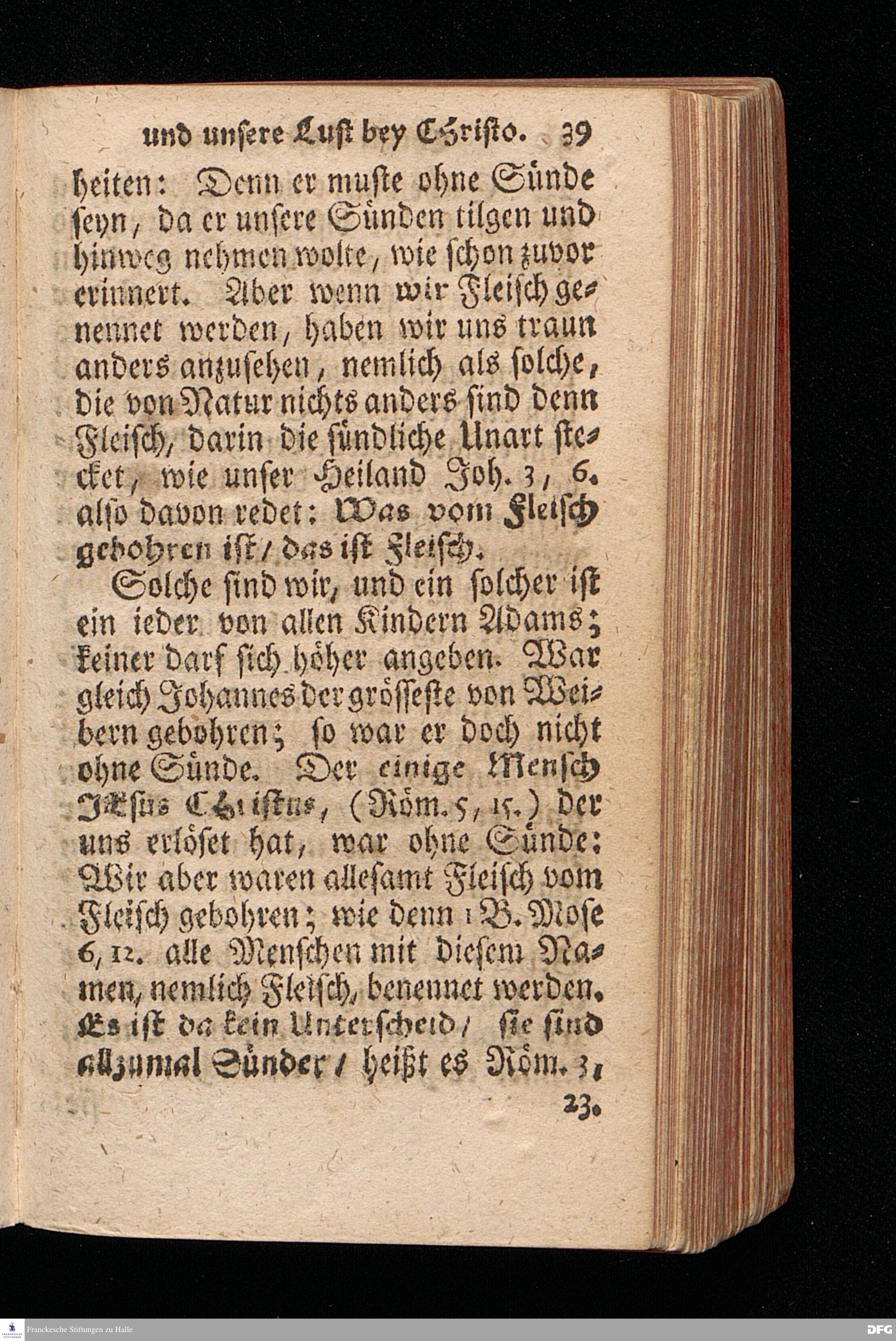 Christi Lust bey uns / und Unsere Lust bey Christo / Am III.Christ=Tage An.1717. In einer Uber den ordentlichen Evangelischen Text Joh.I, 1--14. In der Stadt=Kirchen zu Blaubeuren im Hertzogthum Würtemberg, Auf Erfordern Sr.Hochwürden des ietzigen Herrn Prälaten und gantzen Ministerii daselbst, gehaltenen Und auf Verlangen in den Druck gegebenen Predigt vorgestellet von August Hermann Francken / S.Theol.Prof.Past.und Scholarcha zu Halle im Hertzogthum Magdeburg. HALLE, Gedruckt im Wäysen=Hause. Anno 1718.