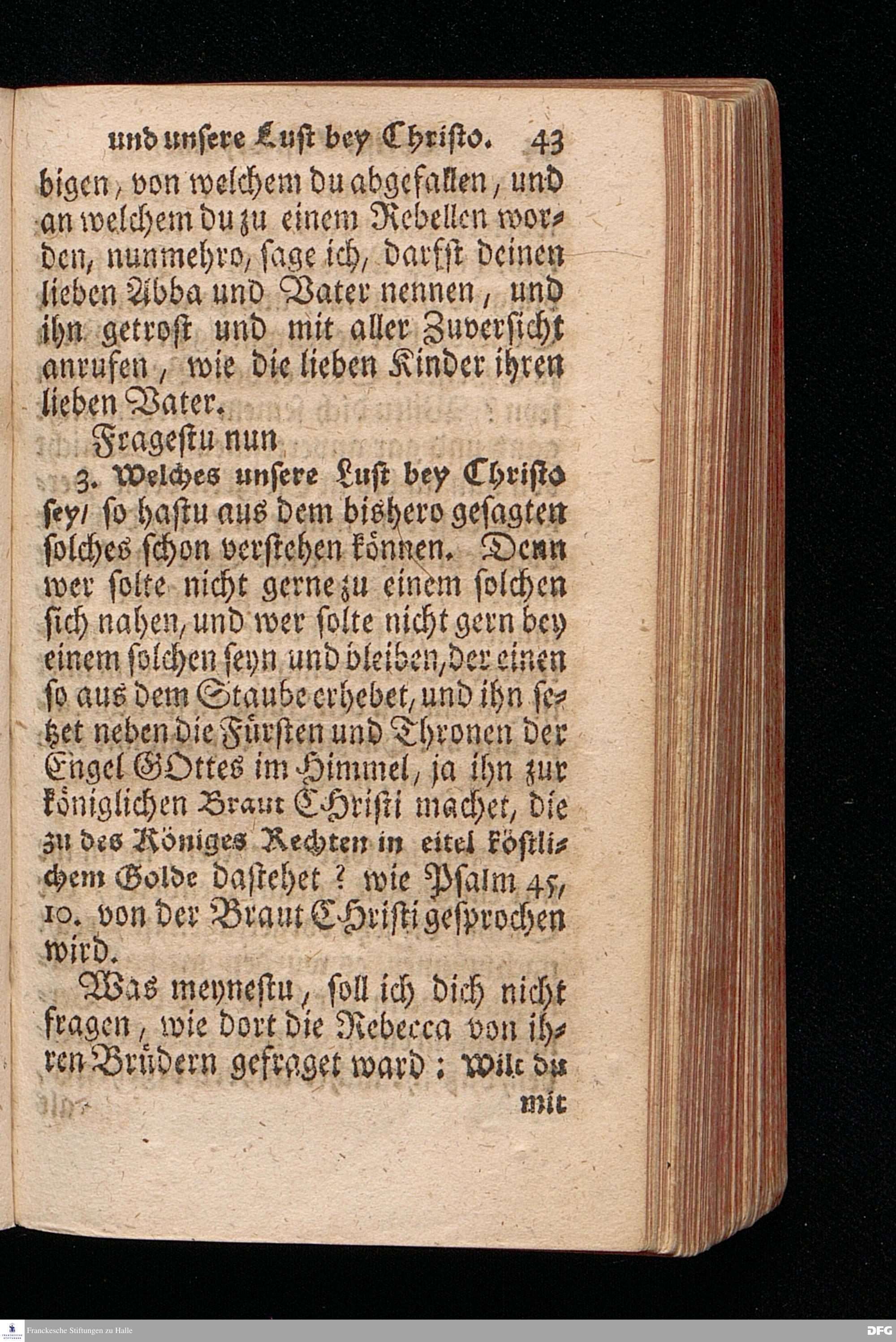 Christi Lust bey uns / und Unsere Lust bey Christo / Am III.Christ=Tage An.1717. In einer Uber den ordentlichen Evangelischen Text Joh.I, 1--14. In der Stadt=Kirchen zu Blaubeuren im Hertzogthum Würtemberg, Auf Erfordern Sr.Hochwürden des ietzigen Herrn Prälaten und gantzen Ministerii daselbst, gehaltenen Und auf Verlangen in den Druck gegebenen Predigt vorgestellet von August Hermann Francken / S.Theol.Prof.Past.und Scholarcha zu Halle im Hertzogthum Magdeburg. HALLE, Gedruckt im Wäysen=Hause. Anno 1718.