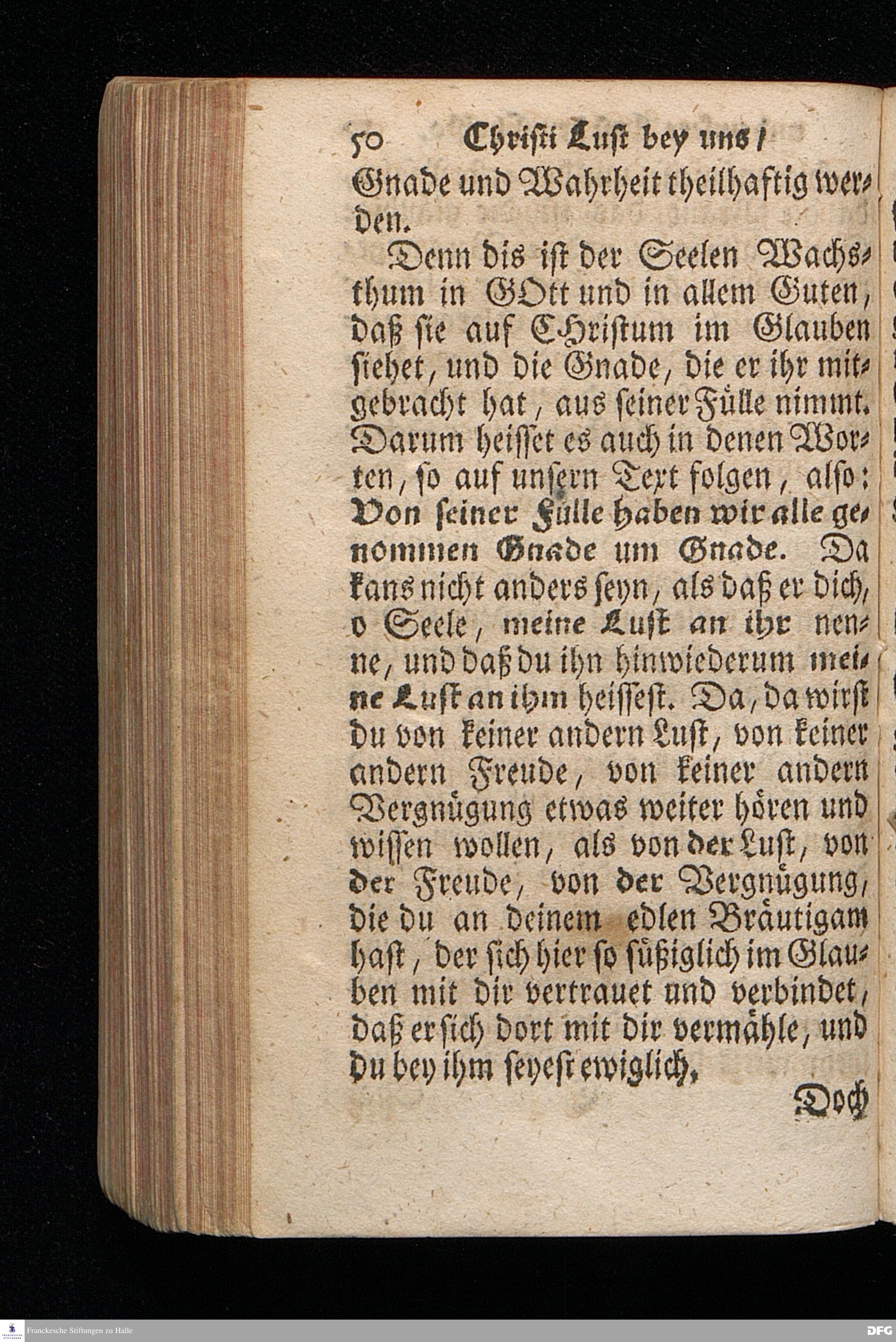 Christi Lust bey uns / und Unsere Lust bey Christo / Am III.Christ=Tage An.1717. In einer Uber den ordentlichen Evangelischen Text Joh.I, 1--14. In der Stadt=Kirchen zu Blaubeuren im Hertzogthum Würtemberg, Auf Erfordern Sr.Hochwürden des ietzigen Herrn Prälaten und gantzen Ministerii daselbst, gehaltenen Und auf Verlangen in den Druck gegebenen Predigt vorgestellet von August Hermann Francken / S.Theol.Prof.Past.und Scholarcha zu Halle im Hertzogthum Magdeburg. HALLE, Gedruckt im Wäysen=Hause. Anno 1718.