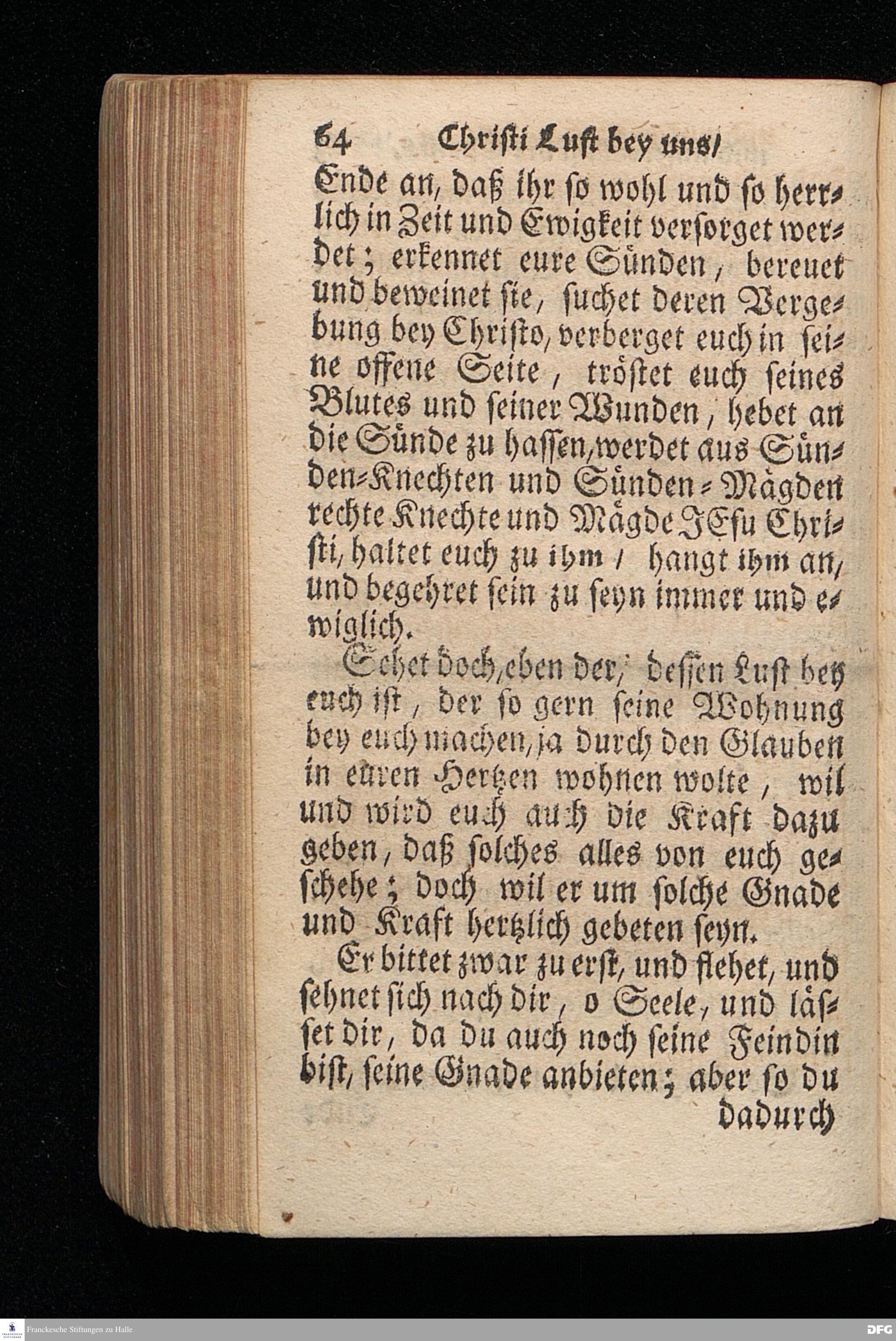 Christi Lust bey uns / und Unsere Lust bey Christo / Am III.Christ=Tage An.1717. In einer Uber den ordentlichen Evangelischen Text Joh.I, 1--14. In der Stadt=Kirchen zu Blaubeuren im Hertzogthum Würtemberg, Auf Erfordern Sr.Hochwürden des ietzigen Herrn Prälaten und gantzen Ministerii daselbst, gehaltenen Und auf Verlangen in den Druck gegebenen Predigt vorgestellet von August Hermann Francken / S.Theol.Prof.Past.und Scholarcha zu Halle im Hertzogthum Magdeburg. HALLE, Gedruckt im Wäysen=Hause. Anno 1718.