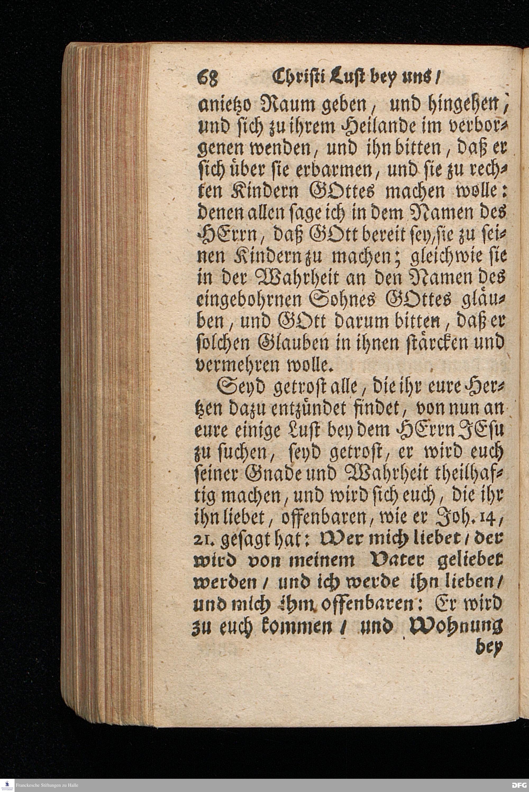Christi Lust bey uns / und Unsere Lust bey Christo / Am III.Christ=Tage An.1717. In einer Uber den ordentlichen Evangelischen Text Joh.I, 1--14. In der Stadt=Kirchen zu Blaubeuren im Hertzogthum Würtemberg, Auf Erfordern Sr.Hochwürden des ietzigen Herrn Prälaten und gantzen Ministerii daselbst, gehaltenen Und auf Verlangen in den Druck gegebenen Predigt vorgestellet von August Hermann Francken / S.Theol.Prof.Past.und Scholarcha zu Halle im Hertzogthum Magdeburg. HALLE, Gedruckt im Wäysen=Hause. Anno 1718.