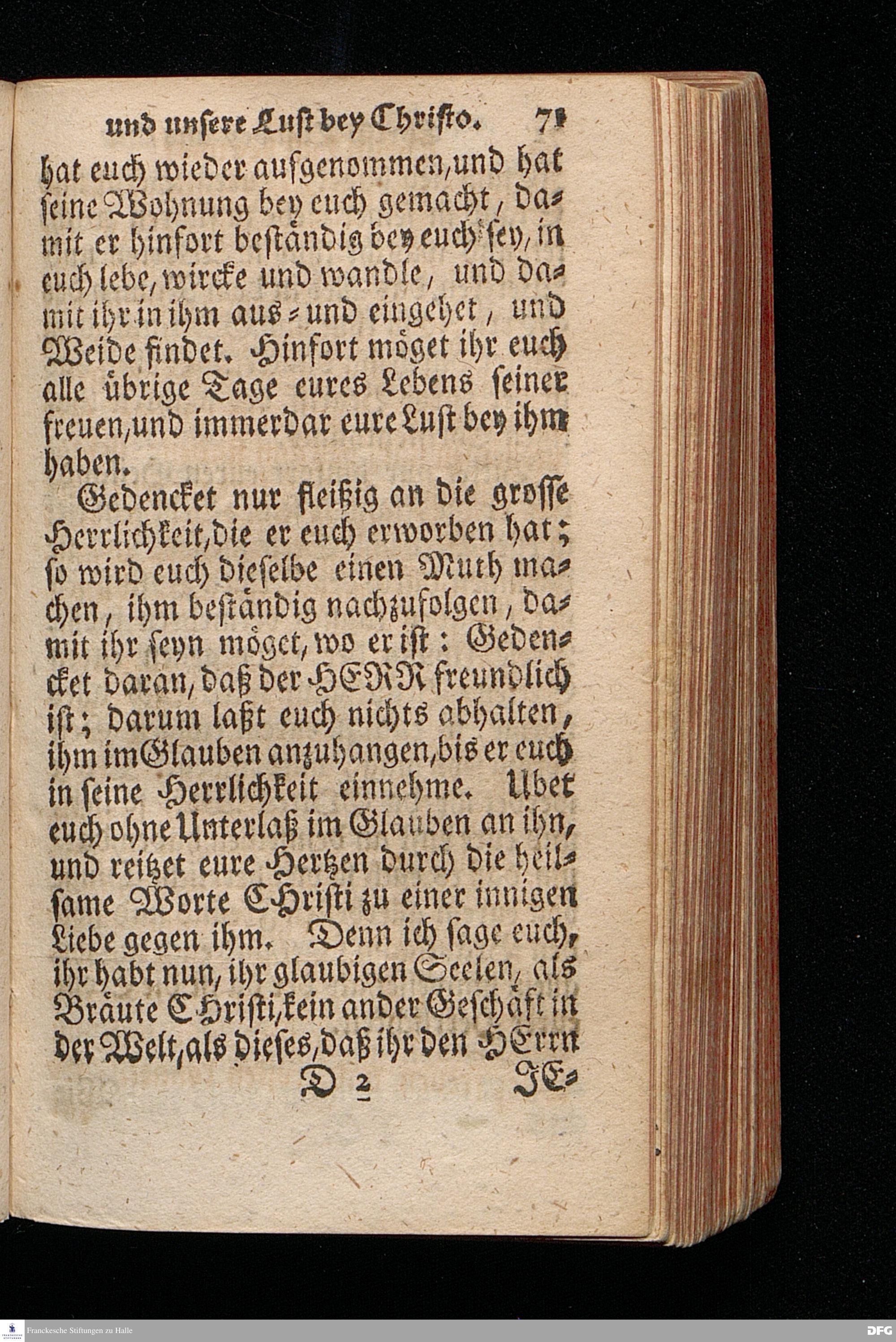 Christi Lust bey uns / und Unsere Lust bey Christo / Am III.Christ=Tage An.1717. In einer Uber den ordentlichen Evangelischen Text Joh.I, 1--14. In der Stadt=Kirchen zu Blaubeuren im Hertzogthum Würtemberg, Auf Erfordern Sr.Hochwürden des ietzigen Herrn Prälaten und gantzen Ministerii daselbst, gehaltenen Und auf Verlangen in den Druck gegebenen Predigt vorgestellet von August Hermann Francken / S.Theol.Prof.Past.und Scholarcha zu Halle im Hertzogthum Magdeburg. HALLE, Gedruckt im Wäysen=Hause. Anno 1718.