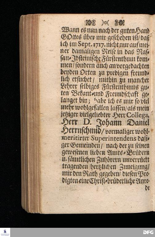 Nassau=Idsteinisches Denck=Maal / In zweyen / zu Wi[e]sbaden am 17.Sonntag nach Trinitatis über Es.VIII,9--15. und zu Idstein am Tage des Apostels Mattäi 1717. über Matth.IX, 9--13. auf Christliches Verlangen gehaltenen / und nun, nebst einer DEDICATION an ein sämtliches Hoch= und Wohl=Ehrwürdiges MINISTERIUM im Fürstenthum Nasssau=Idstein / in den Druck gegebenen Predigten gestiftet von August Hermann Francken / S.Th.Pr.Past.Vlr.& Schol. HALLE, in Verlegung des Wäysen=Hauses MDCCXX.