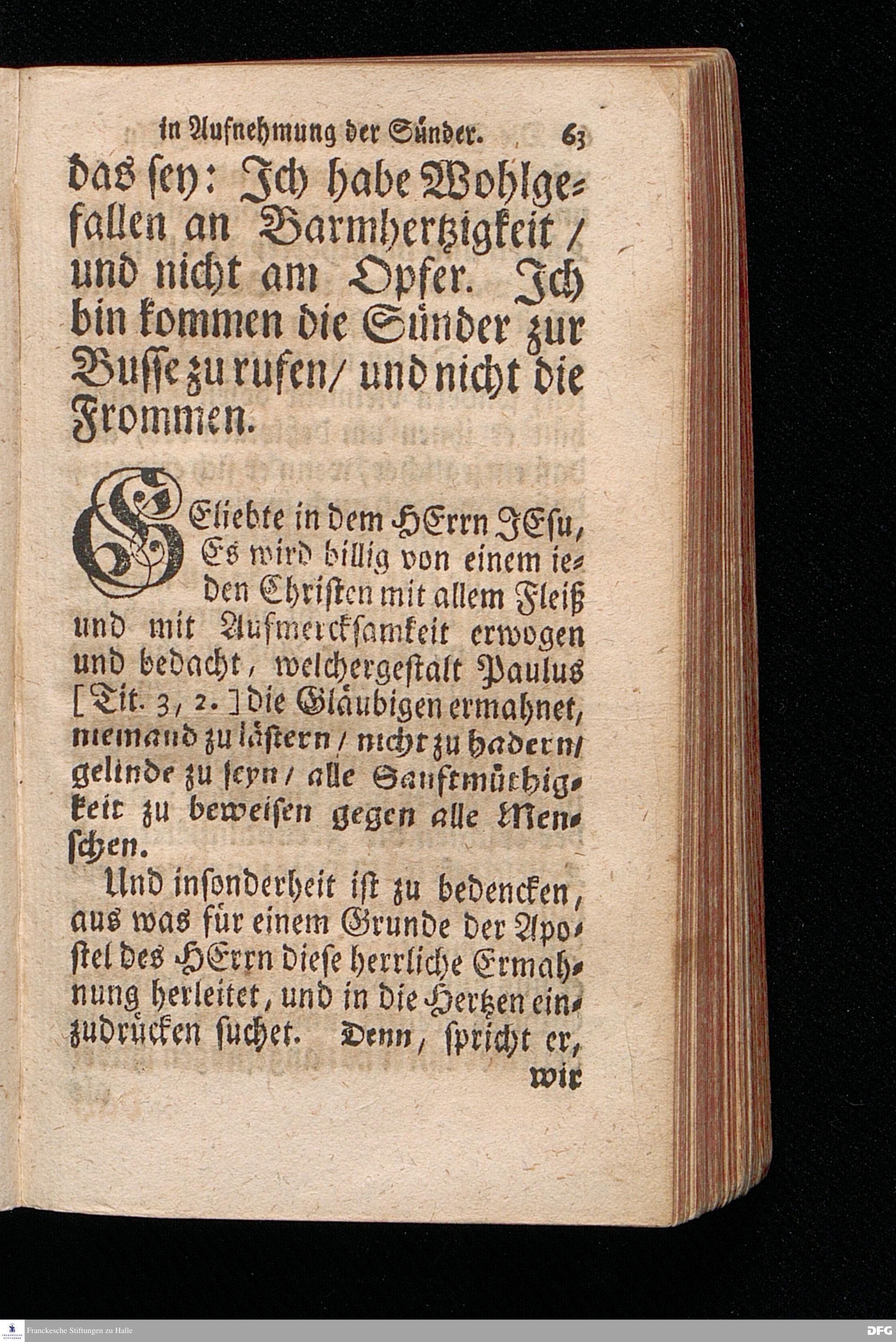 Die Freundlichkeit des HErrn JESU in Aufnehmung der Sünder / Am Tag des Apostels Matthäi 1717. Aus dem ordentlichen Evangelio Matth.IX, 9--13. In der Fürstl.Nassauischen Residentz Idstein bey der damaligen Durchreise in einer auf Verlangen gehaltenen Predigt vorgestellet von August Hermann Francken. [1720]