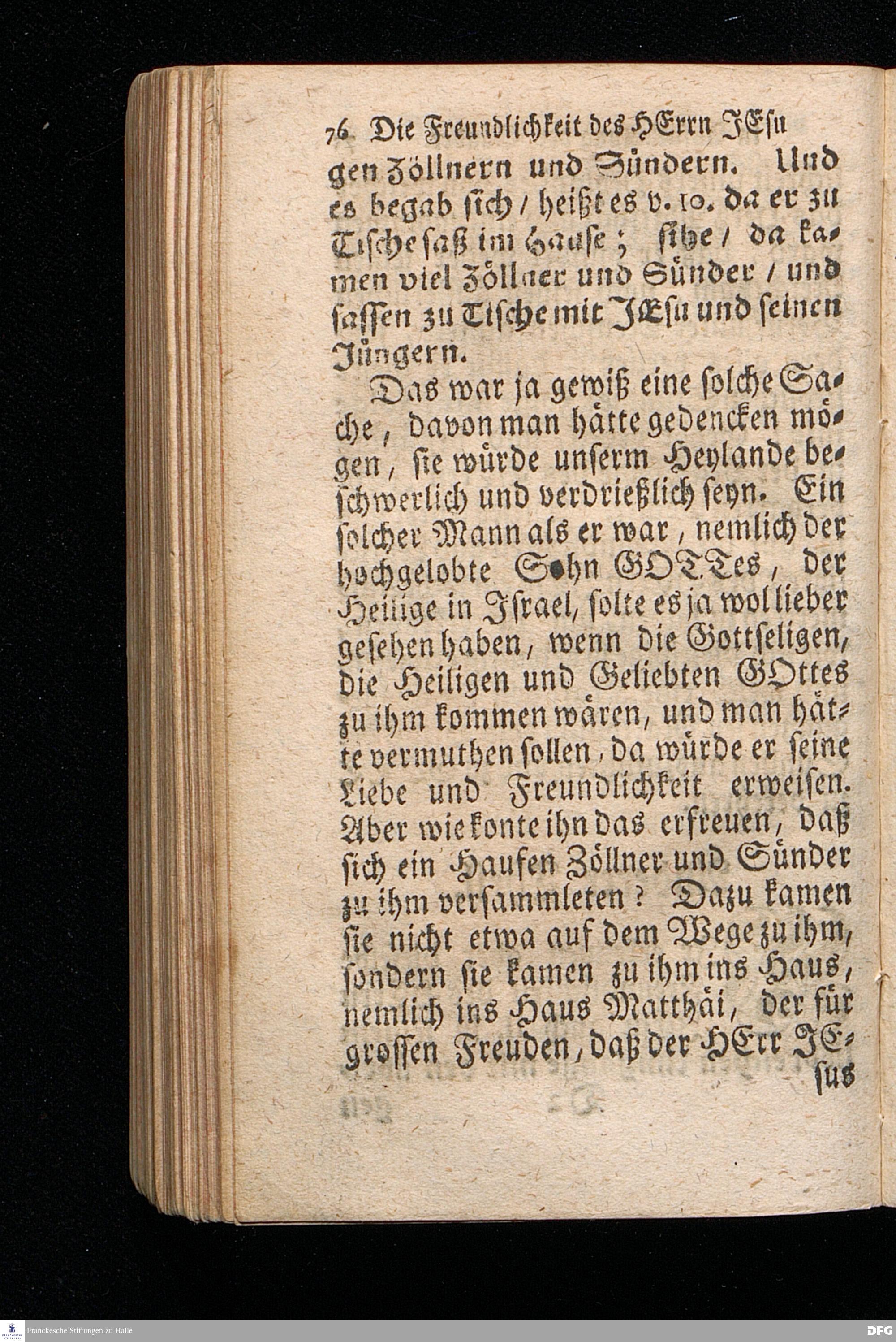 Die Freundlichkeit des HErrn JESU in Aufnehmung der Sünder / Am Tag des Apostels Matthäi 1717. Aus dem ordentlichen Evangelio Matth.IX, 9--13. In der Fürstl.Nassauischen Residentz Idstein bey der damaligen Durchreise in einer auf Verlangen gehaltenen Predigt vorgestellet von August Hermann Francken. [1720]