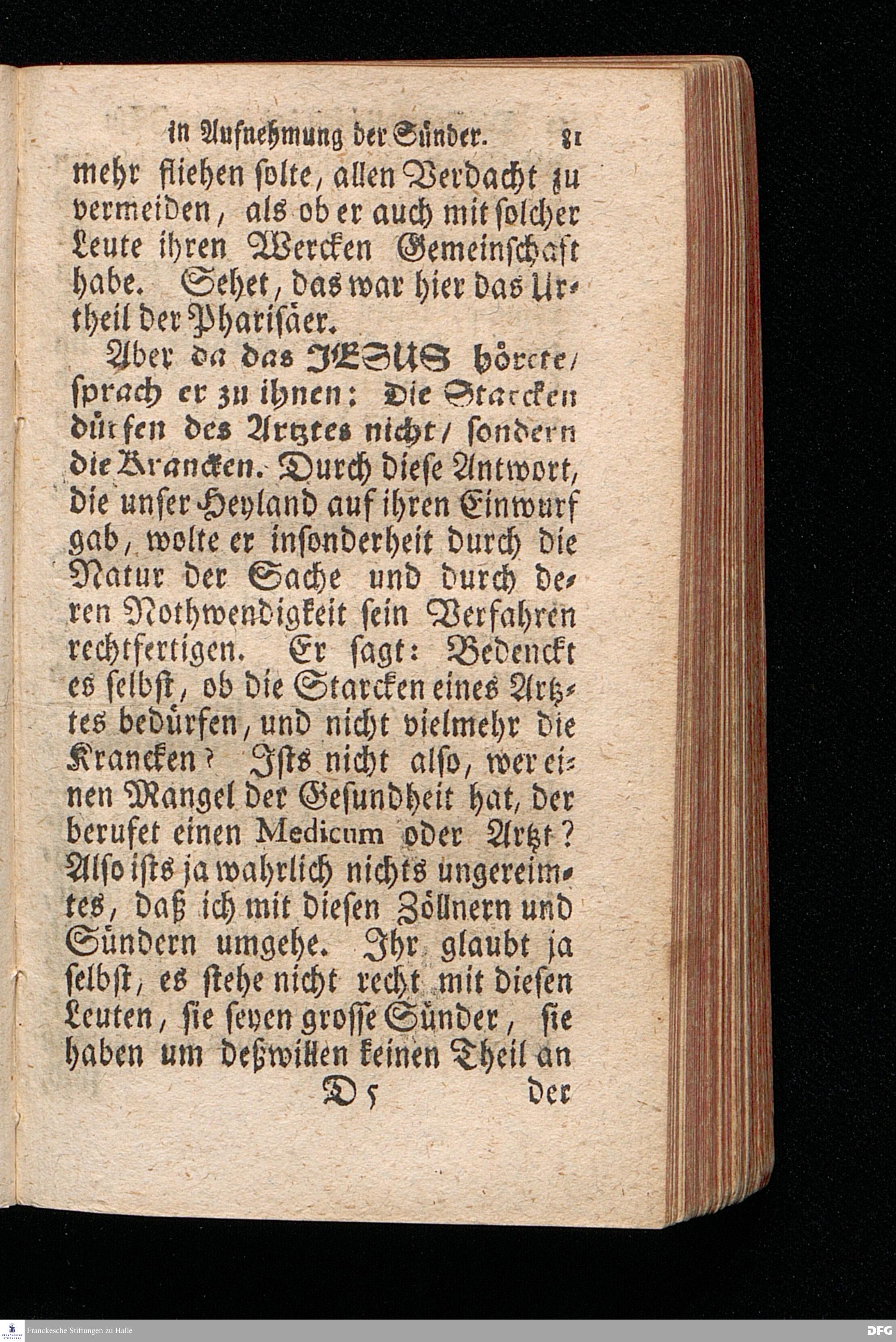 Die Freundlichkeit des HErrn JESU in Aufnehmung der Sünder / Am Tag des Apostels Matthäi 1717. Aus dem ordentlichen Evangelio Matth.IX, 9--13. In der Fürstl.Nassauischen Residentz Idstein bey der damaligen Durchreise in einer auf Verlangen gehaltenen Predigt vorgestellet von August Hermann Francken. [1720]