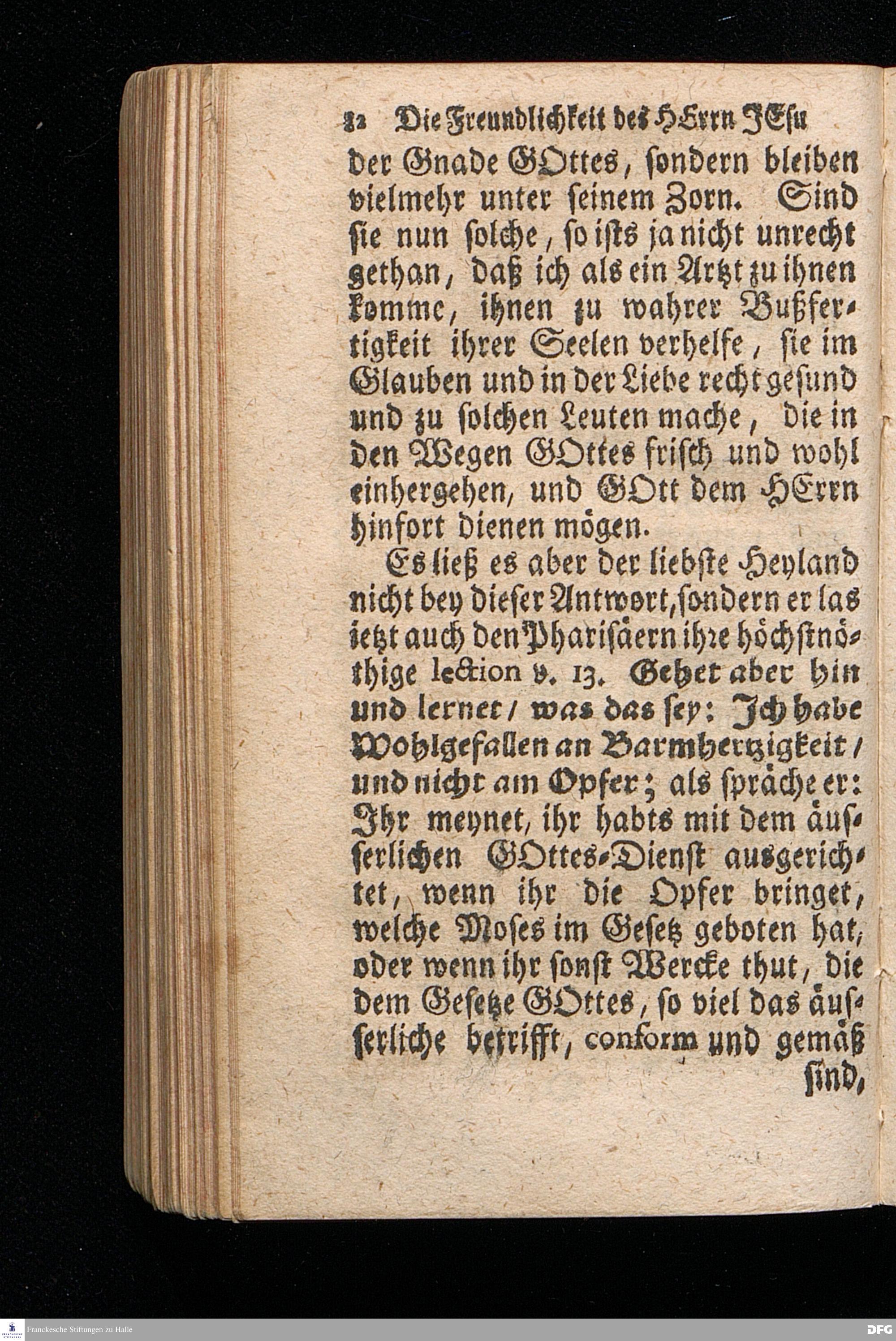 Die Freundlichkeit des HErrn JESU in Aufnehmung der Sünder / Am Tag des Apostels Matthäi 1717. Aus dem ordentlichen Evangelio Matth.IX, 9--13. In der Fürstl.Nassauischen Residentz Idstein bey der damaligen Durchreise in einer auf Verlangen gehaltenen Predigt vorgestellet von August Hermann Francken. [1720]