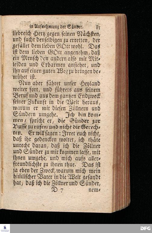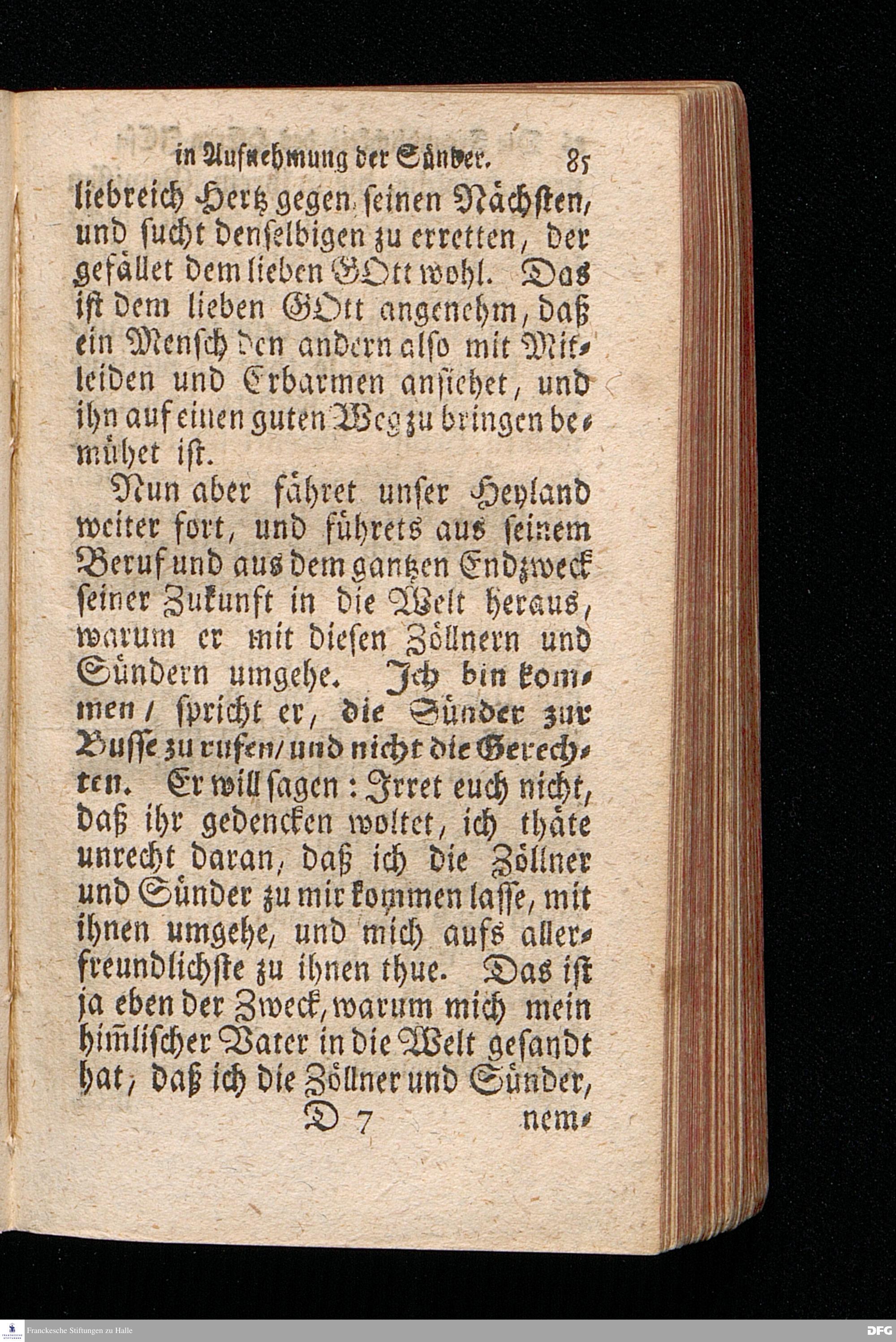 Die Freundlichkeit des HErrn JESU in Aufnehmung der Sünder / Am Tag des Apostels Matthäi 1717. Aus dem ordentlichen Evangelio Matth.IX, 9--13. In der Fürstl.Nassauischen Residentz Idstein bey der damaligen Durchreise in einer auf Verlangen gehaltenen Predigt vorgestellet von August Hermann Francken. [1720]